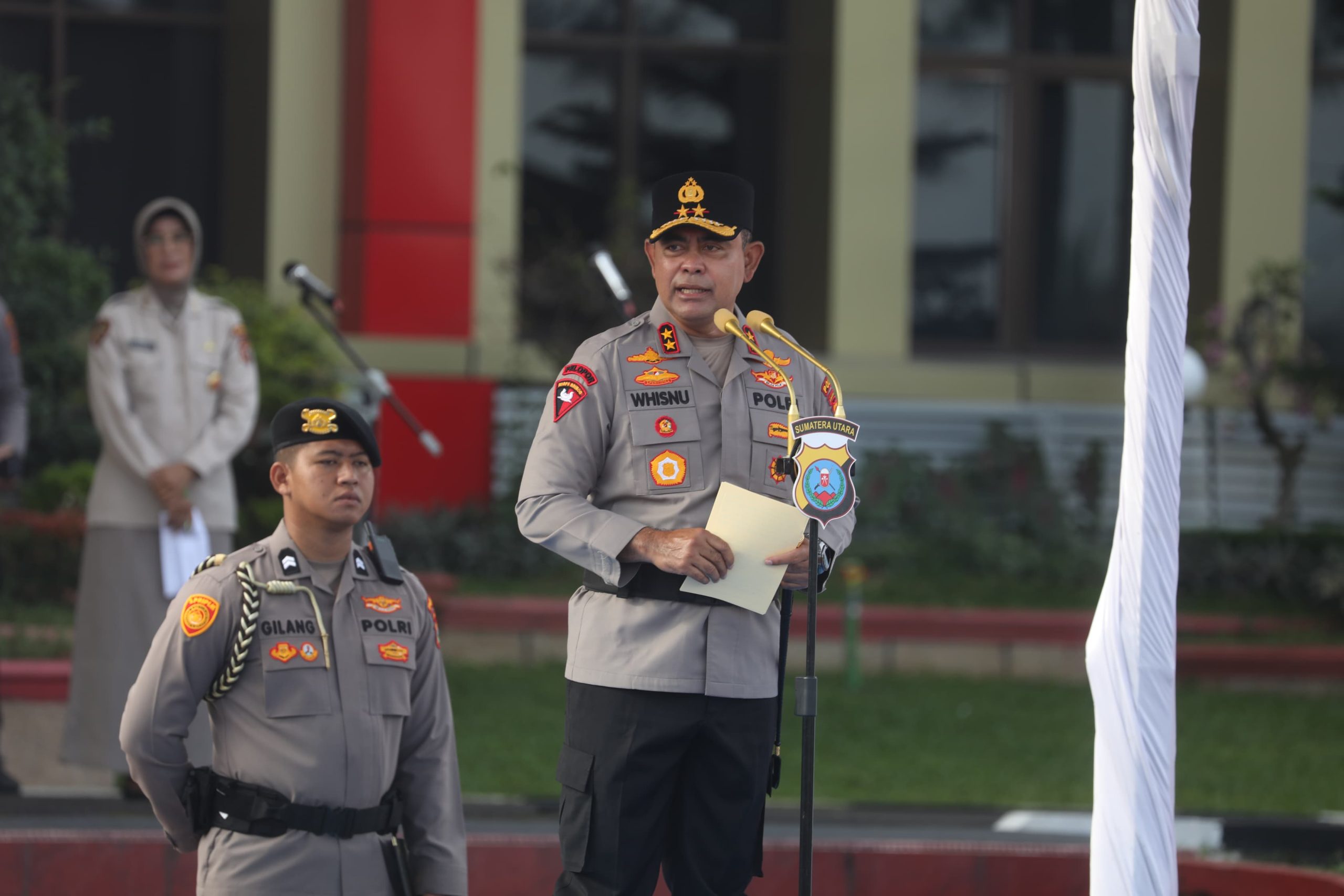 Upacara dipimpin Kapolda Sumut, Irjen Pol. Whisnu Hermawan Februanto, S.IK., MH., dihadiri Ketua Bhayangkari Daerah Sumut beserta Pengurus, Wakapolda Sumut, Irwasda, para Pejabat Utama Polda Sumut, serta seluruh Personel Penerima Kenaikan Pangkat.