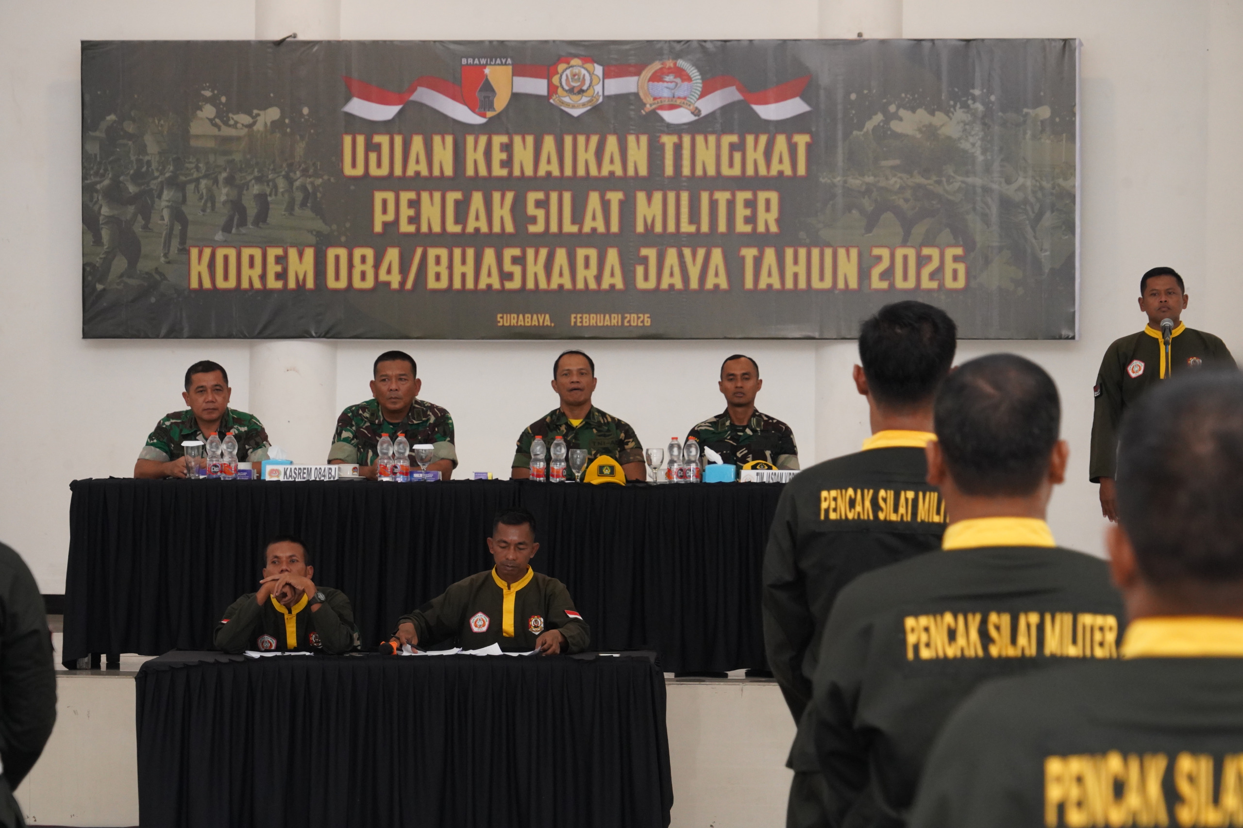 Sebanyak 132 personel Makorem 084/Bhaskara Jaya (BJ) mengikuti Ujian Kenaikan Tingkat (UKT) Pencak Silat Militer (PSM) Tahun 2026 yang dilaksanakan pada Rabu (11/2/2026) di Aula Bhaskara Korem 084/BJ.