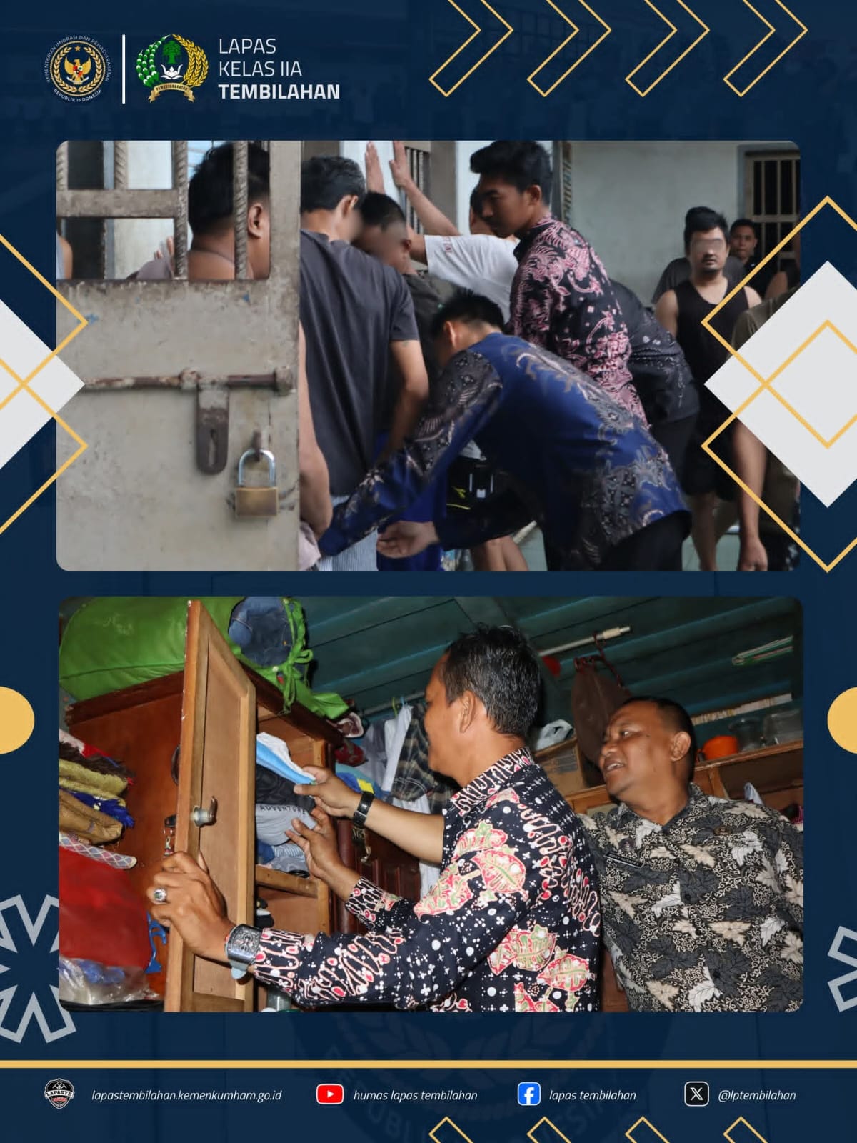 Lembaga Pemasyarakatan Kelas IIA Tembilahan kembali melaksanakan razia rutin kamar hunian sebagai upaya menjaga keamanan dan ketertiban di dalam lapas. Kegiatan ini dilaksanakan pada Jumat, 23 Januari 2026, dengan sasaran kamar hunian Blok Mahoni kamar 09 dan 13. Razia rutin tersebut merupakan bagian dari langkah preventif yang dilaksanakan secara berkelanjutan sesuai ketentuan peraturan perundang-undangan di bidang pemasyarakatan.