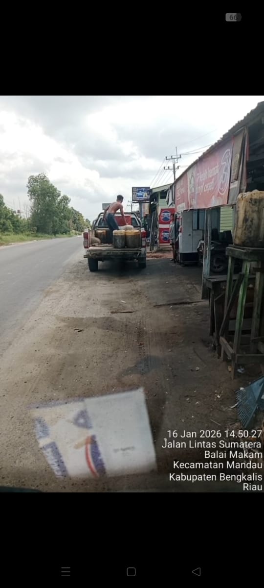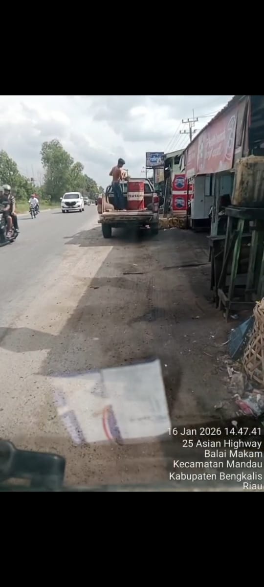 16 Januari 2026: Aktivitas tersebut masih berlanjut secara terang-terangan, bahkan terekam mobil bak terbuka (Pick-Up) melakukan bongkar muat jeriken di siang bolong tepat di pinggir jalan lintas utama.