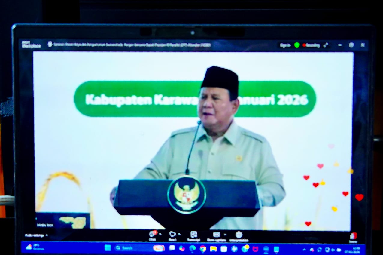 Pernyataan tersebut disampaikan usai Bupati Muba mengikuti Panen Raya Nasional sekaligus Pengumuman Swasembada Pangan Tahun 2025 yang dirangkaikan dengan pemberian penghargaan dari Presiden Republik Indonesia kepada daerah dan tokoh berprestasi, secara virtual, Rabu (07/01/2026), bertempat di Ruang Rapat Guest House Griya Bumi Serasan Sekate.