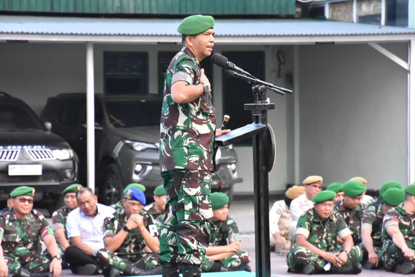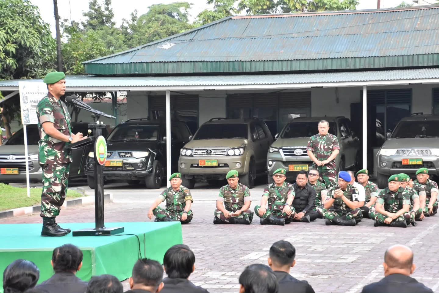 Komandan Korem 031/Wira Bima memberikan pengarahan kepada prajurit dan PNS Korem 031/WB dengan menekankan profesionalisme, kedewasaan, dan kepedulian terhadap lingkungan tugas.