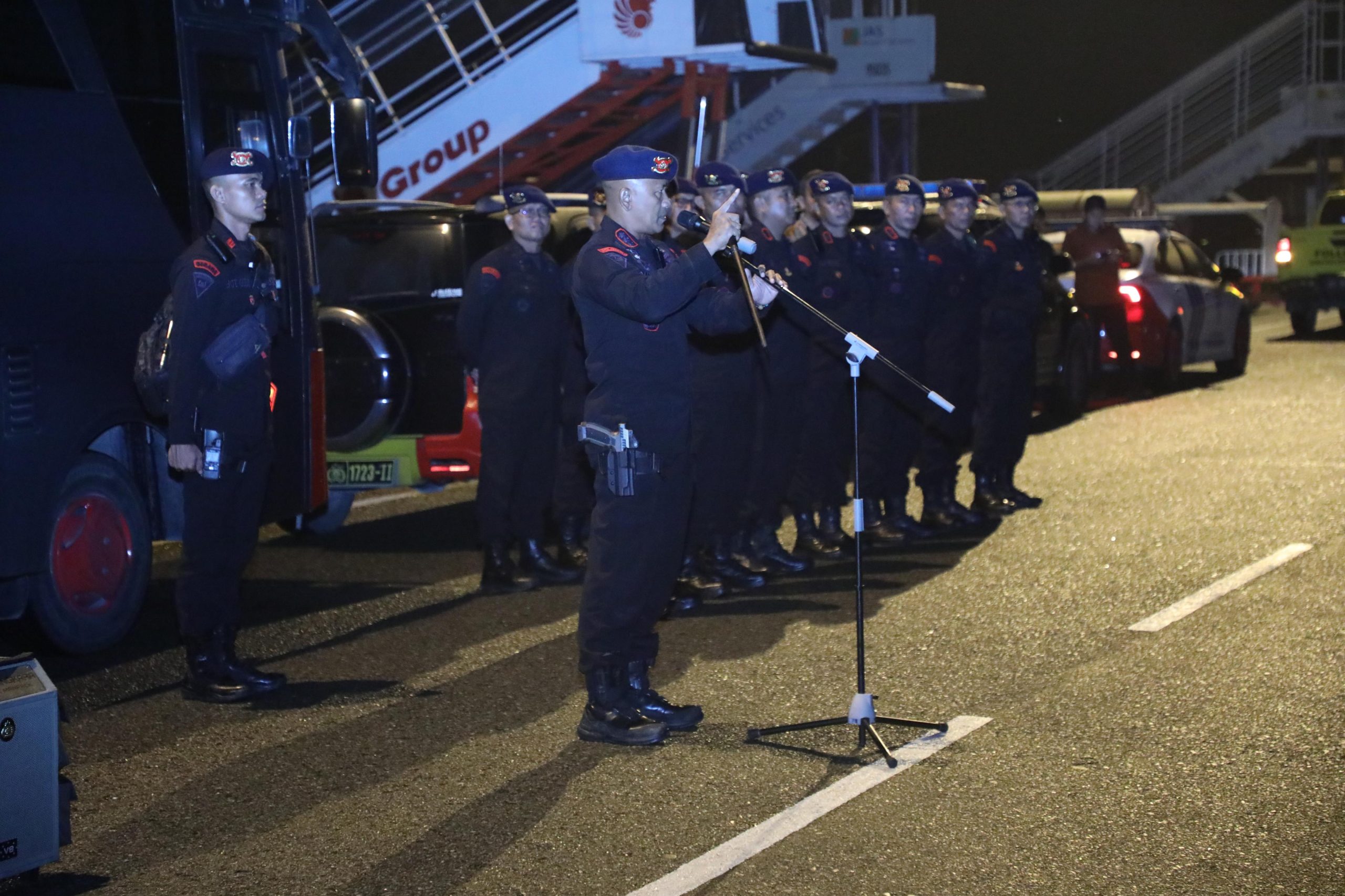 Apel Pengecekan Pasukan dipimpin Dansat Brimob, dilanjutkan doa bersama memohon keselamatan dan kelancaran selama penugasan.