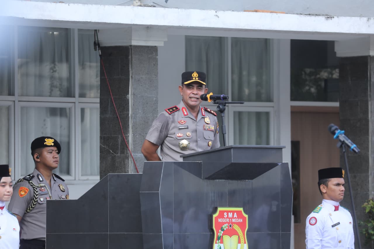 Kapolda Sumut jadi Inspektur Upacara Bendera di Sekolah SMA Negeri 1 Medan, Senin (22/09/2025), dan menyampaikan amanat penuh makna bagi para Siswa-Siswi. Kehadirannya disambut antusias para Guru, Staf, dan seluruh Pelajar yang mengikuti upacara dengan khidmat.