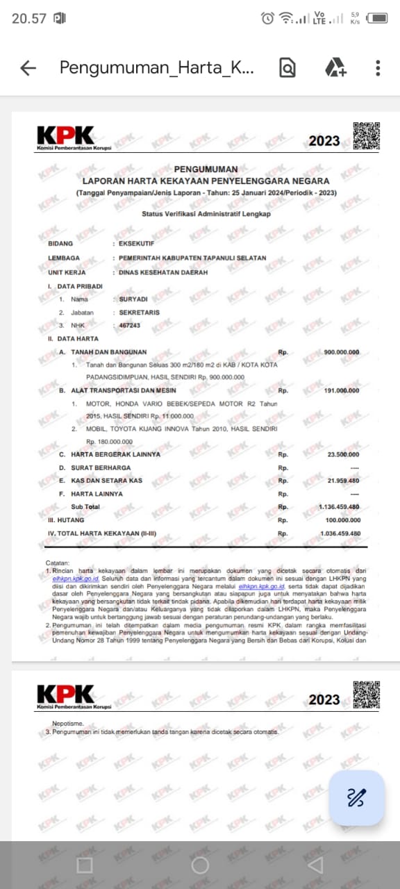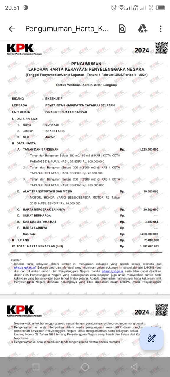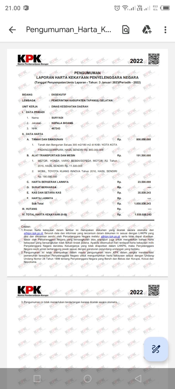 Suryadi oknum pejabat di Pemkab Tapsel yang saat ini menduduki jabatan Sekretaris di Dinas Kesehatan Kabupaten Tapanuli Selatan (Tapsel) – Sumatera Utara ternyata berdasarkan laman pengumuman Laporan Harta Kekayaan Penyelenggara Negara (LHKPN) memiliki total harta kekayaan dengan rincian sebagai berikut :