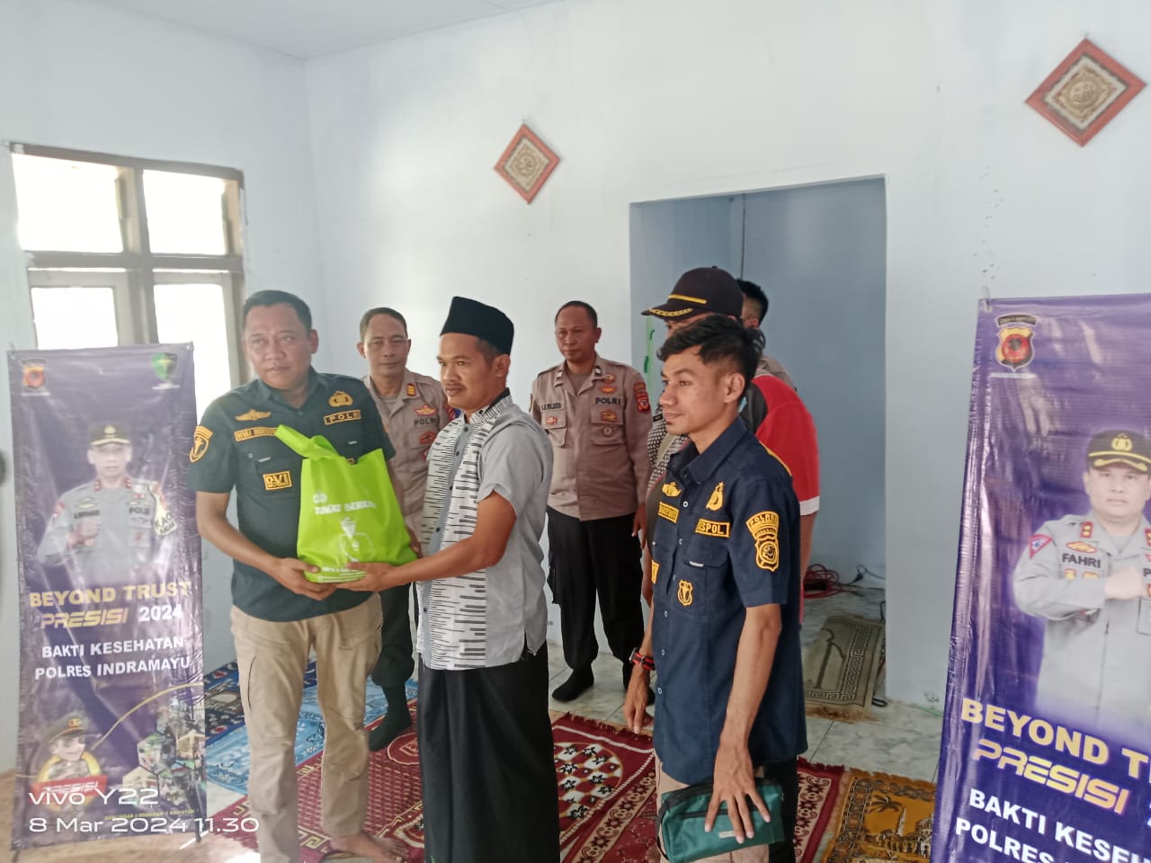 Polsek patrol beserta Dokes Polres Indramayu gelar kegiatan bakti kesehatan dan pembagian sembako di setiap musholla yang berada di Kecamatan Patrol, Jum’at (08/03/2024) .