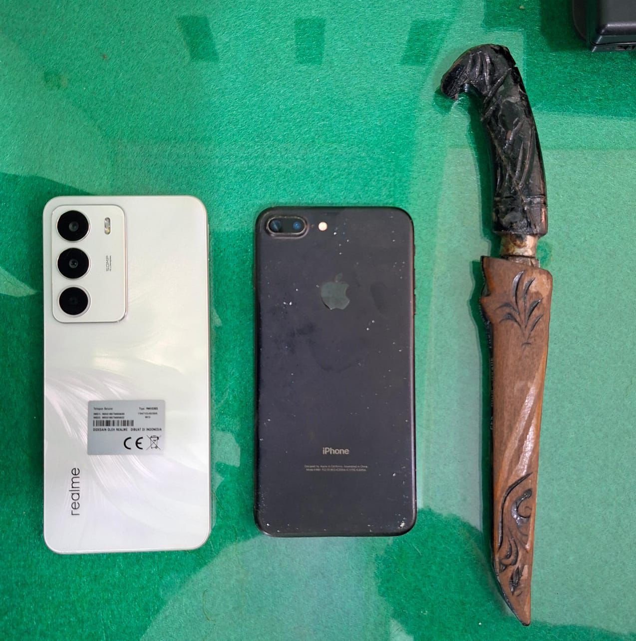 Saat dilakukan penangkapan, Petugas menemukan Ponsel, Jenis Realme milik Korban’ pada Pelaku. Selain itu, MS juga kedapatan membawa Sebilah Senjata Tajam, Jenis Belati yang diselipkan di pinggangnya.