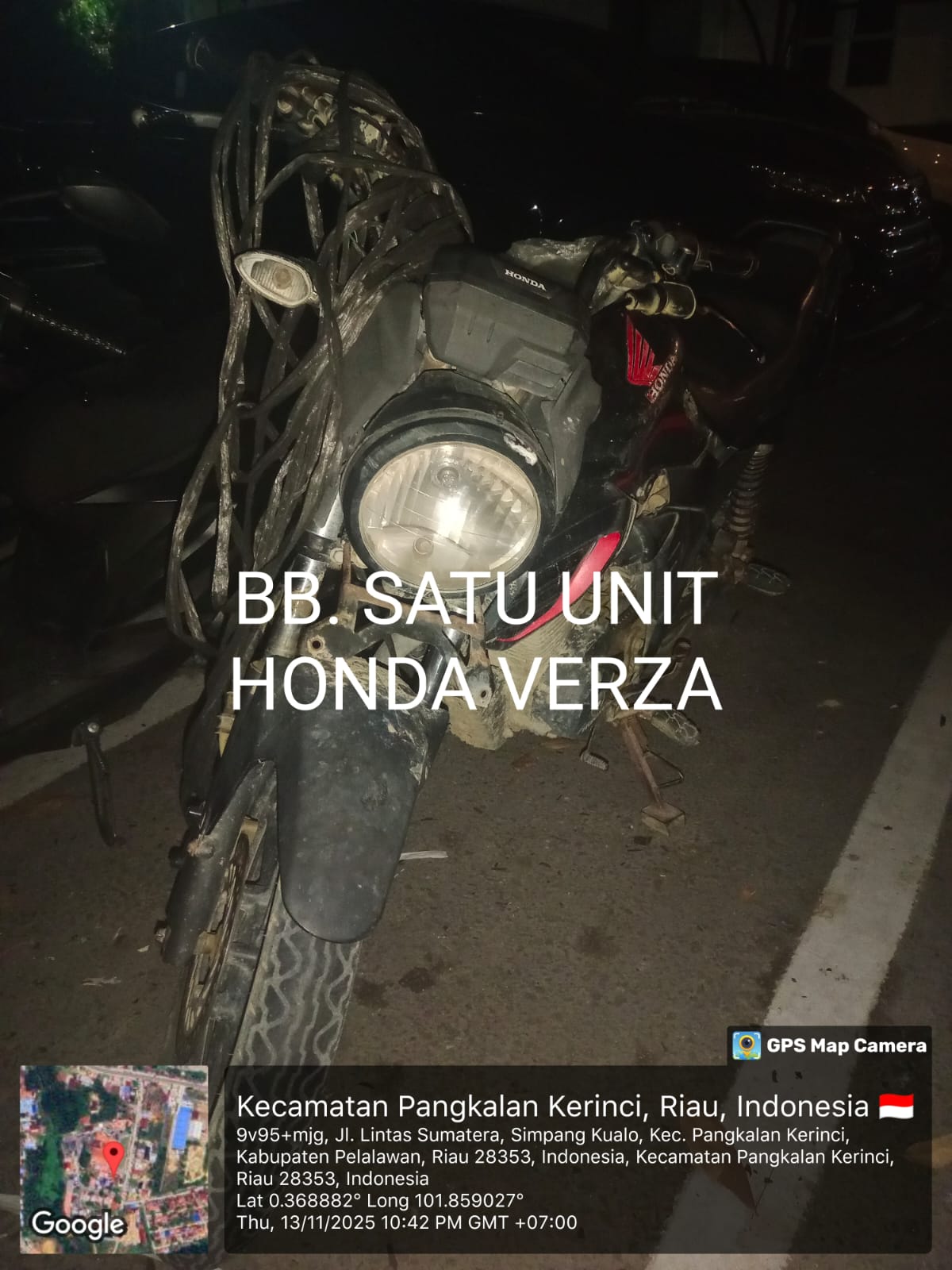 Pada hari Kamis, 13 November 2025, sekira pukul 19.00 WIB, terjadi pencurian sepeda motor di Simpang PT. Musim Mas Lama, Pangkalan Lesung, Pelalawan. Korban, M D M, melaporkan bahwa sepeda motornya merk Virza dengan nomor polisi BM 2131 YBL telah dicuri oleh seseorang laki-laki tidak dikenal.