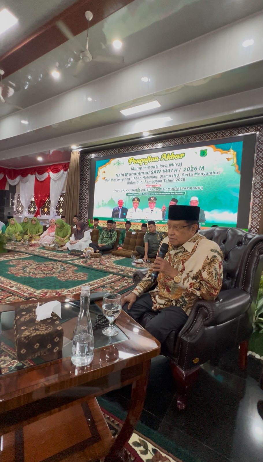 Nada-nada sholawatan serta lantunan ayat suci Al-Quran bergema di Pendopoan Griya Bumi Serasan Sekate. Sebagai sebuah moment dalam memperingati Isra Mi’raj Nabi Muhammad SAW 1447 H / 2026 M sekaligus 1 Abad Nahdlatul Ulama (NU) di Kabupaten Musi Banyuasin, Selasa (27/01/2025).