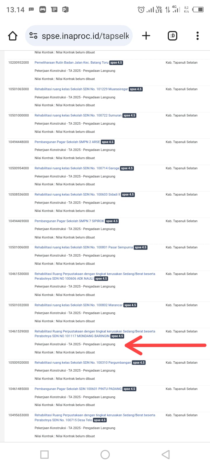 Pasalnya, pantauan wartawan di lokasi, Sabtu (15/11/2025) pihak ketiga (rekanan) sudah bekerja, padahal dalam laman pengumuman LPSE Kab. Tapsel terlihat, Nilai kontrak : Nilai kontrak belum dibuat. Sementara untuk jadwal penandatanganan kontrak tertulis, Penandatanganan Kontrak mulai 17 November 2025 sampai 21 November 2025.