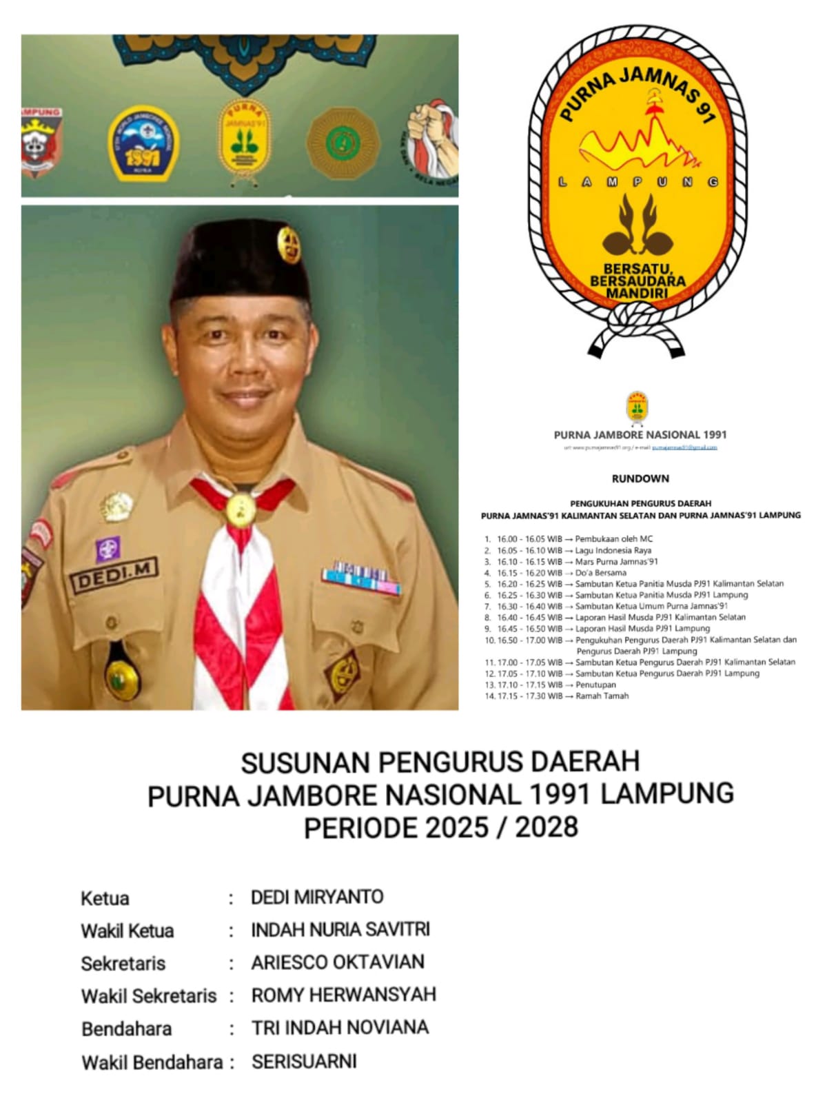 Ketua pelaksana kegiatan, yang diwakili juga oleh Sekretaris terpilih 2025 ariesco, menyatakan bahwa tujuan dari kegiatan ini adalah untuk mengukuhkan pengurus perdana serta memberikan semangat sesuai moto pjn91 : Bersatu Bersaudara Mandiri.Ia juga banyak berterima kasih berbagai pihak yg mensukseskan giat ini, dimana terpilih pengurus pjn91 prop.lampung 2025-2028,ketua terpilih Dedi miryanto.se,wakil ketua : indah Nuria savitri,SE.M.diplomacy & trade, sekretarsi : ariesco oktavian,wakil sekretaris : Romy Herwansyah, bendahara : tri indah Noviana & wakilnya : srisuarni.