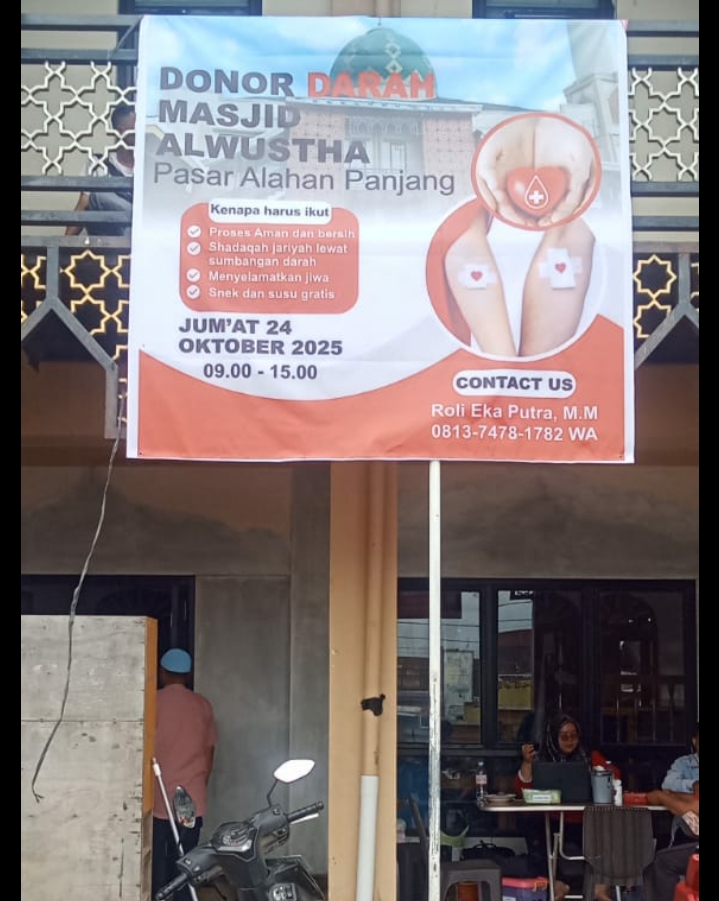 Dalam semangat kepedulian dan kemanusiaan, Pengurus Masjid Al-Wustha Alahan Panjang menggelar kegiatan donor darah gratis bekerja sama dengan Palang Merah Indonesia (PMI) Kabupaten Solok, Provinsi Sumatera Barat.