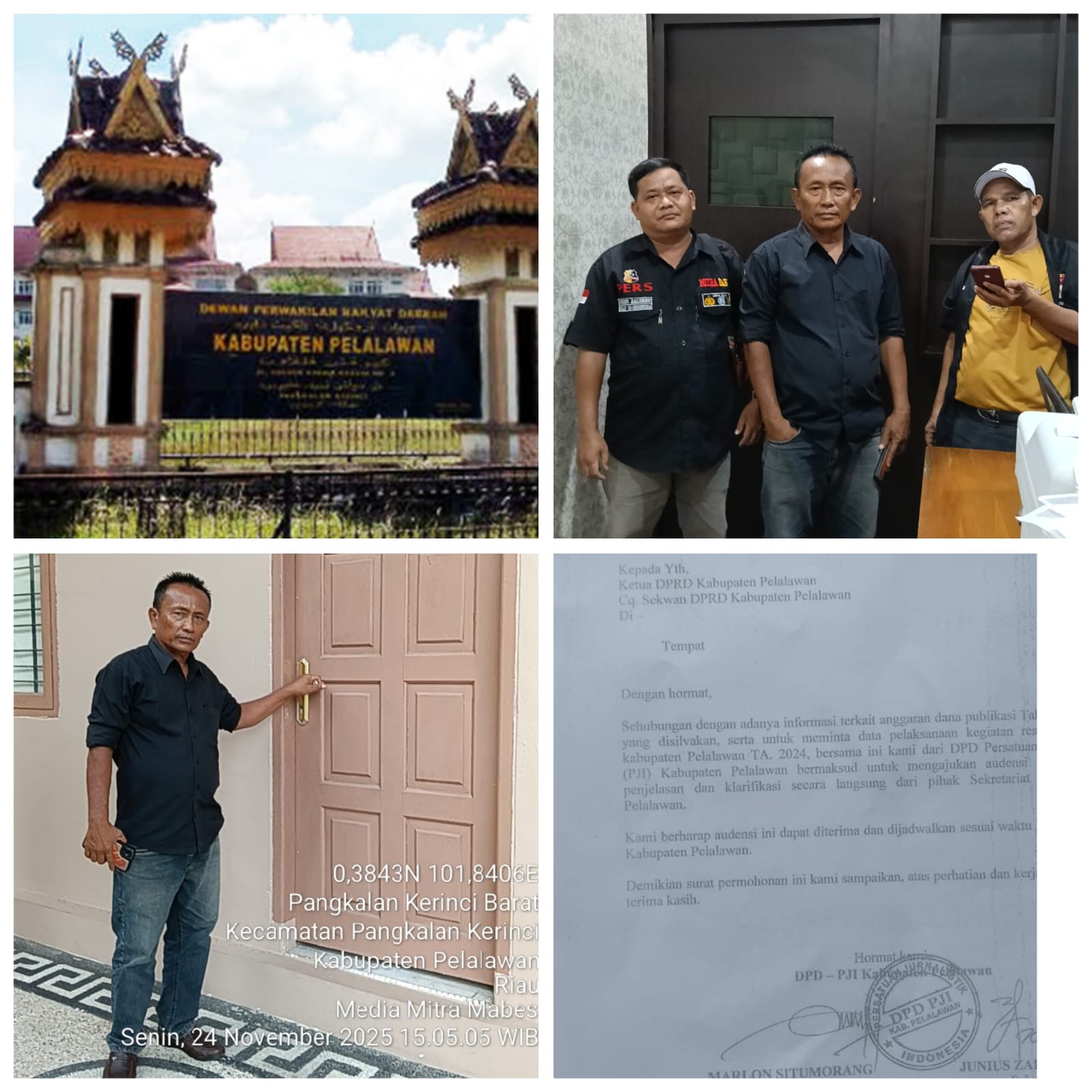 Dewan Pimpinan Daerah Persatuan Jurnalis Indonesia (DPD PJI) Kabupaten Pelalawan resmi mendatangi dan melakukan audiensi dengan DPRD Kabupaten Pelalawan, menuntut penjelasan terbuka terkait gagalnya penyaluran anggaran publikasi dan kerja sama media tahun 2024.