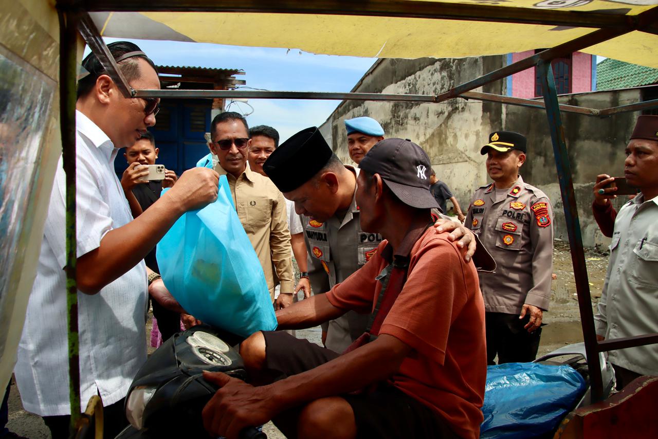 Ungkapan kepedulian kepada Masyarakat yang terdampak Musibah Banjir Rob, Plt. Kapolres Pelabuhan Belawan, AKBP Wahyudi Rahman, SH., S.IK., MM., CPHR., CBA., turun ke lapangan memberikan bantuan Sembako kepada Warga di Pajak Baru Belawan, Jumat (07/11/2025).
