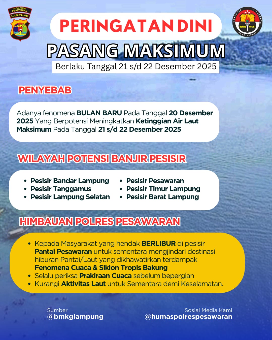 Kepolisian Resor Pesawaran merilis peringatan dini terkait potensi kenaikan air laut pasang maksimum yang diprediksi akan terjadi pada tanggal 21 sampai dengan 22 Desember 2025. Langkah antisipasi ini diambil untuk melindungi masyarakat dan wisatawan yang berada di wilayah pesisir Kabupaten Pesawaran.
