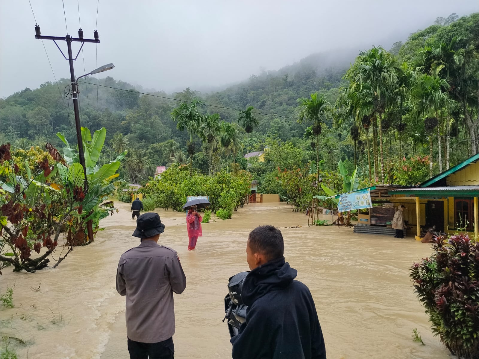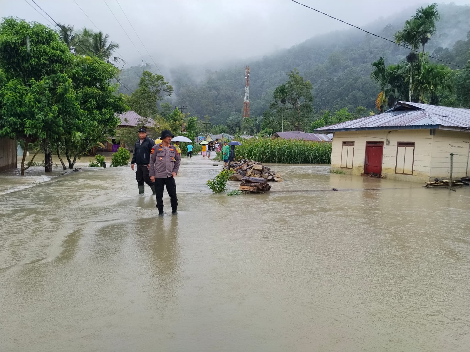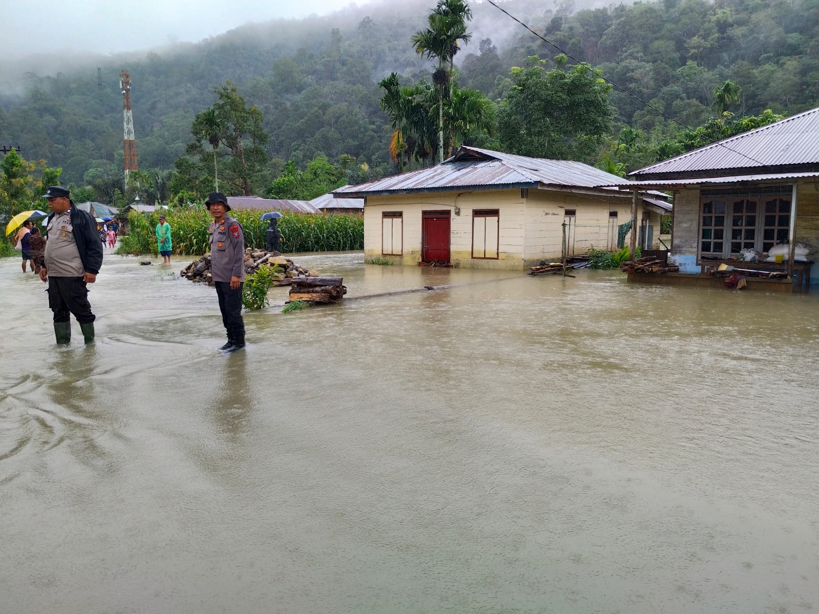 Personel Polsek Pahae Jae, Polres Tapanuli Utara, mengevakuasi Warga begitu menerima laporan terjadi Bencana Banjir dan Tanah Longsor di Desa Sitolubahal dan Desa Robean, Kecamatan Purbatua, Kabupaten Tapanuli Utara, Selasa (25/11/2025).