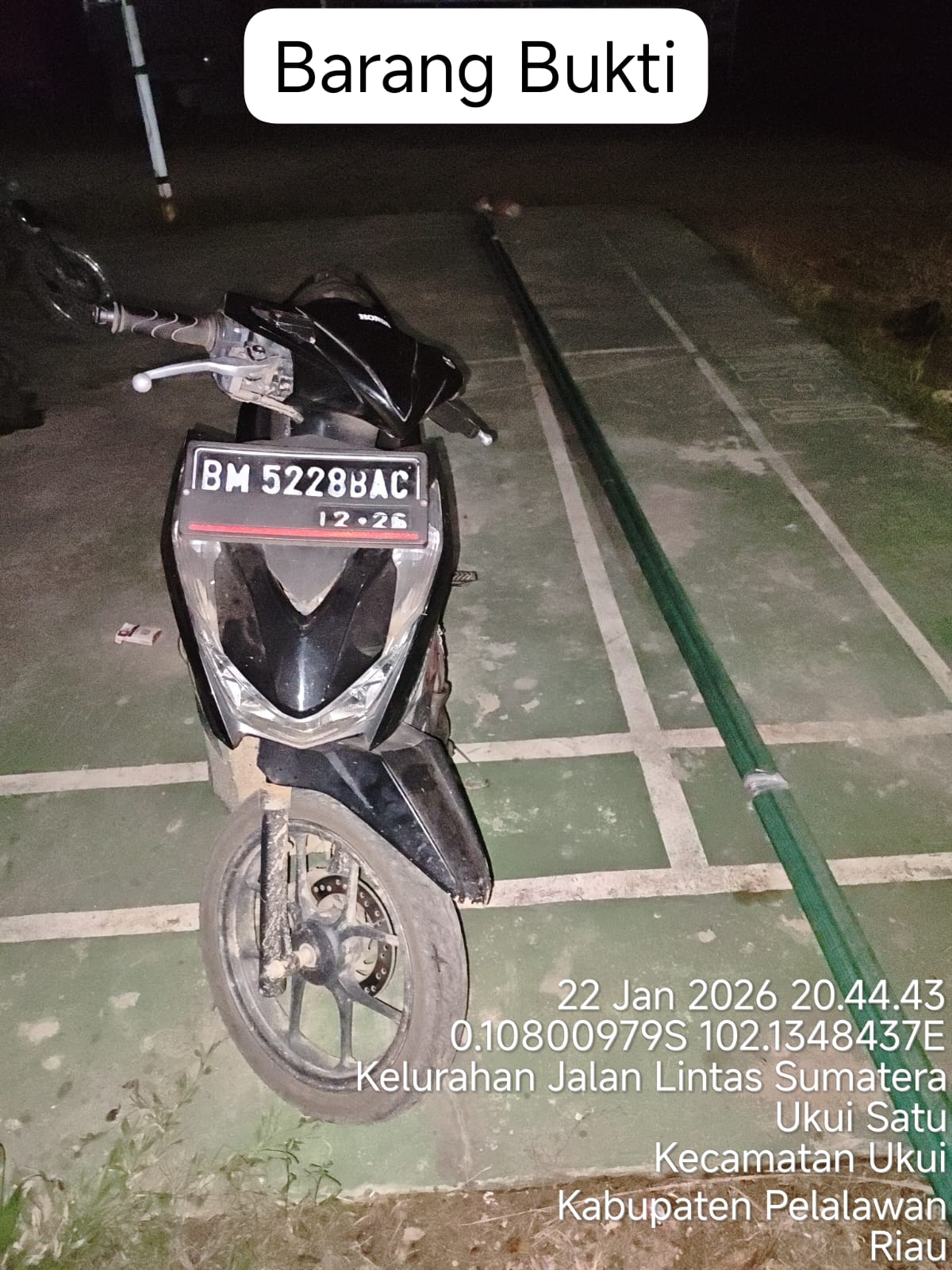 Barang bukti yang disita antara lain 2 (dua) batang Galah Palm Pro warna hijau, 1 (satu) unit sepeda motor merek Honda Beat warna hitam dengan Nopol 5228 BAC , Kerugian yang dialami oleh PT. Inti Indosawit Subur sebesar Rp 3.000.000,- (Tiga Juta Rupiah),