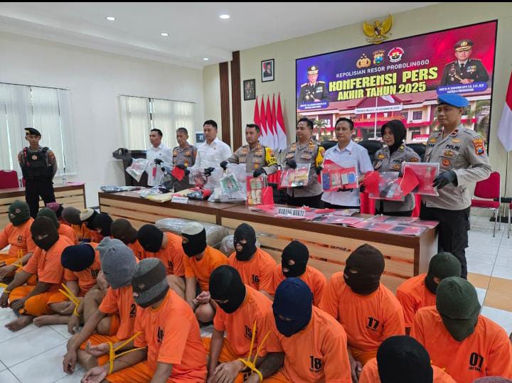 Polres Probolinggo Kota membeberkan capaian kinerja sepanjang tahun 2025 dalam konferensi pers akhir tahun yang digelar di Mapolres Probolinggo Kota, Senin (29/12/25) siang. Sepanjang 2025, Polres mencatat sejumlah tren positif di bidang keamanan dan ketertiban masyarakat, mulai dari penurunan kasus narkotika, penurunan kecelakaan lalu lintas, hingga keberhasilan pengungkapan berbagai kasus kriminal yang menyita perhatian publik.