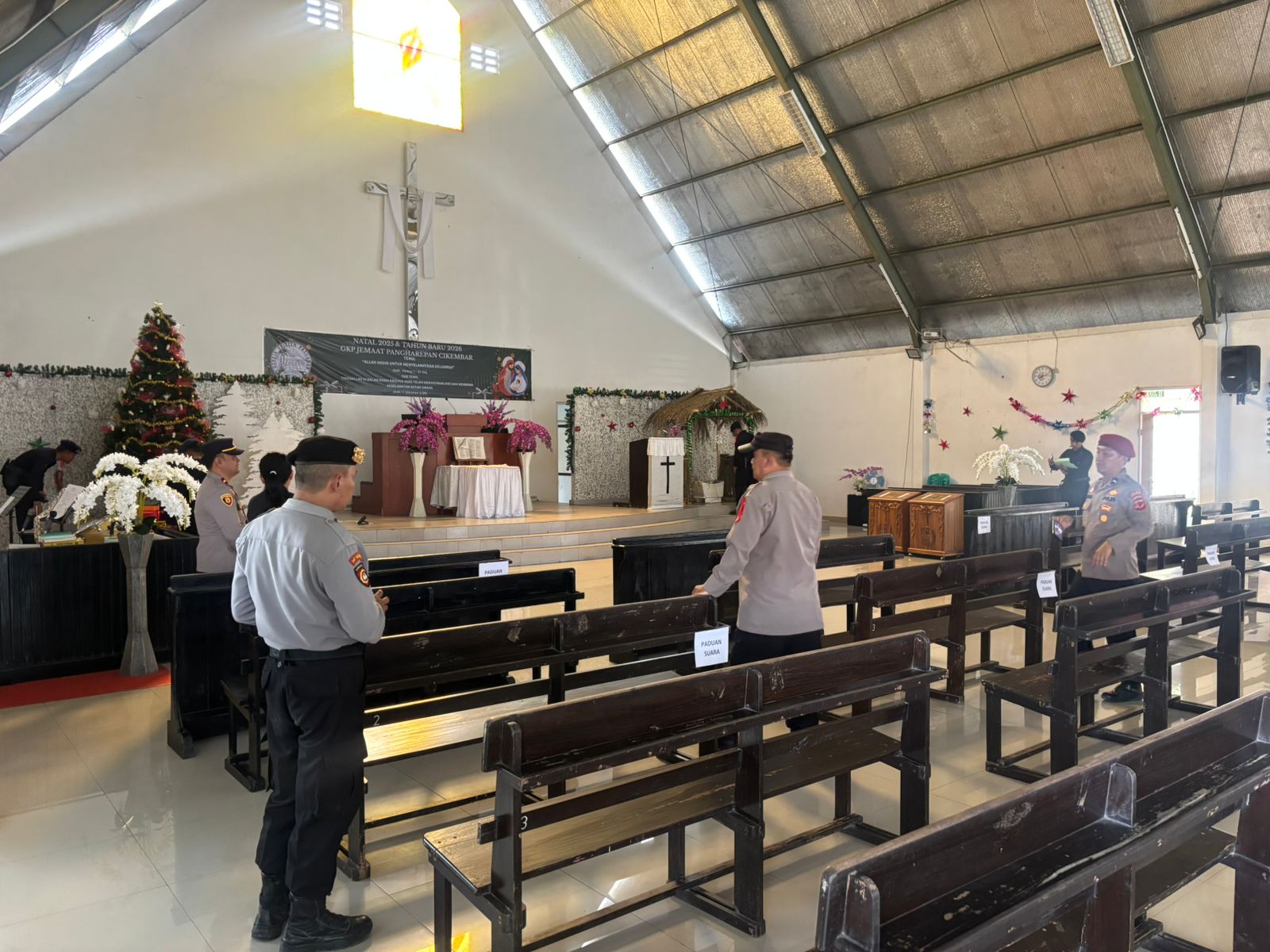 Polres Sukabumi Kabupaten bersama Team Jibom Polda Jabar memperketat melakukan pemeriksaan dan juga pengecekan guna menjamin pengamanan dan kelancaran ibadah Natal di wilayah kabupaten Sukabumi. Pada hari ini, Selasa (23/12/2025), menjelang pelaksanaan kebaktian dan perayaan Natal 2026, Tim Jibom bersama dengan Team Sabara Polres Sukabumi melakukan sterilisasi intensif di Gereja DPdI Siloam Palabuanrtu, Kecamatan Palabuhanratu sukabumi.