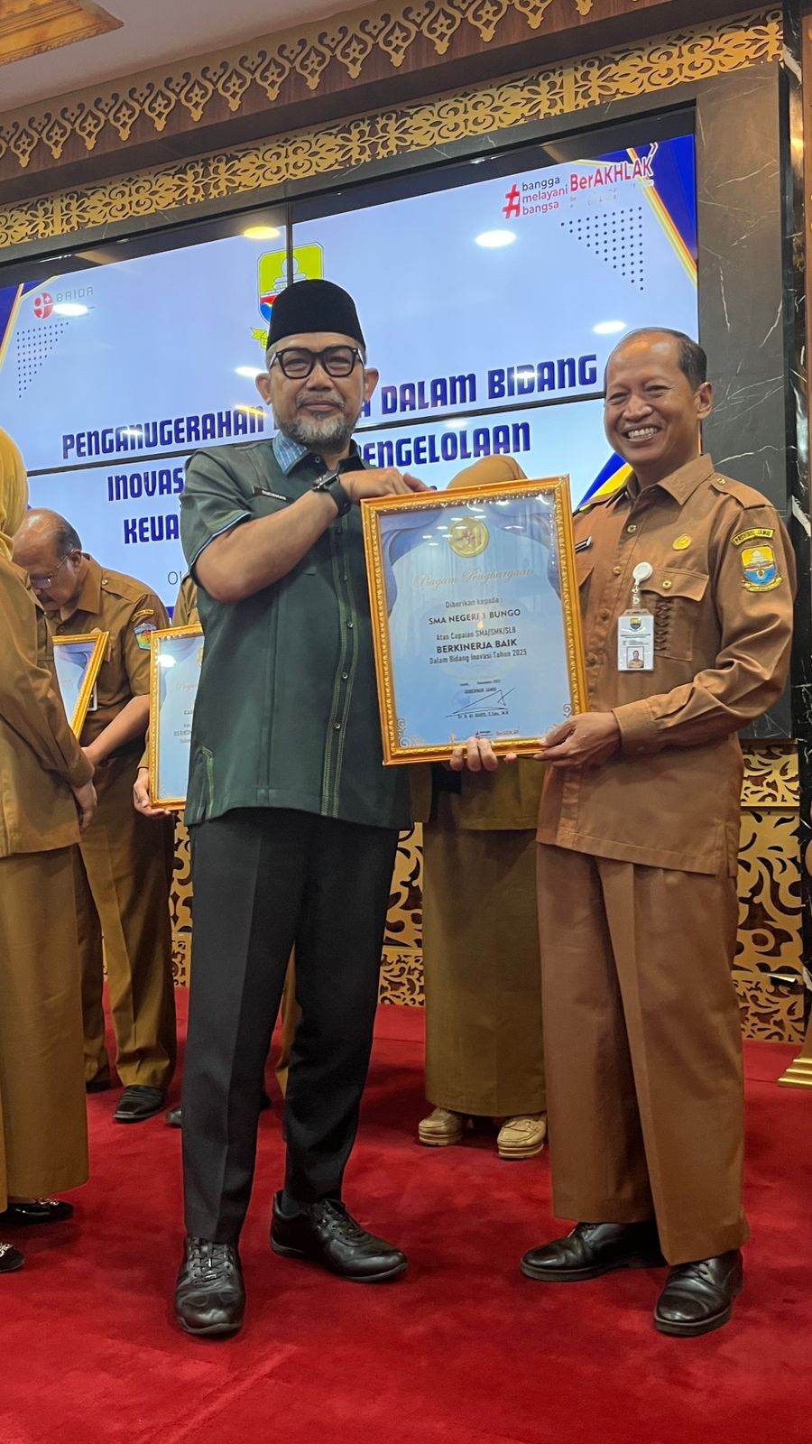 Kabar membanggakan datang dari dunia pendidikan Kabupaten Bungo. SMA Negeri 1 Bungo berhasil meraih Anugerah Kategori Sekolah Berinovasi dan Berkinerja Baik yang diberikan langsung oleh Gubernur Jambi. Penghargaan ini menjadi bukti nyata atas komitmen dan kerja keras seluruh warga sekolah dalam meningkatkan mutu pendidikan.