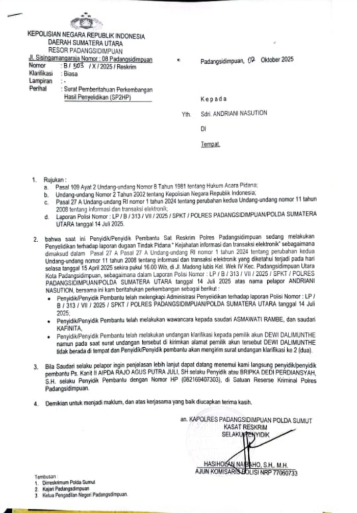 Alasan tidak sampainya surat undangan klarifikasi ke tangan polisi ternyata dituangkan dalam Surat Pemberitahuan Perkembangan Penyelidikan (SP2HP) nomor : B/503/ X / 2025/ Reskrim, tanggal 02 Oktober 2024. Dalam point 2 butir ketiga surat dimaksud menjelaskan : Penyidik / Penyidik Pembantu telah melakukan undangan klarifikasi kepada pemilik akun Dewi Delimunthe namun pada saat surat undangan tersebut dikirimkan alamat pemilik akun tersebut Dewi Dalimunthe tidak berada di tempat dan Penyidik/Penyidik Pembantu akan mengirim surat undangan klarifikasi ke 2 (dua).