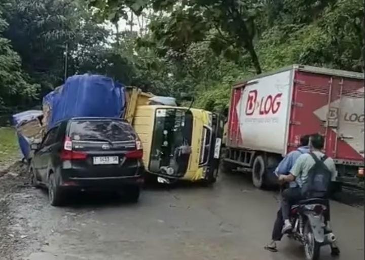 “Di lokasi kejadian, kondisi jalan menikung ke kiri dan permukaannya bergelombang. Diduga pengemudi truk kehilangan kendali hingga kendaraan terguling ke sisi kanan jalan,” ujar Wangsit.
