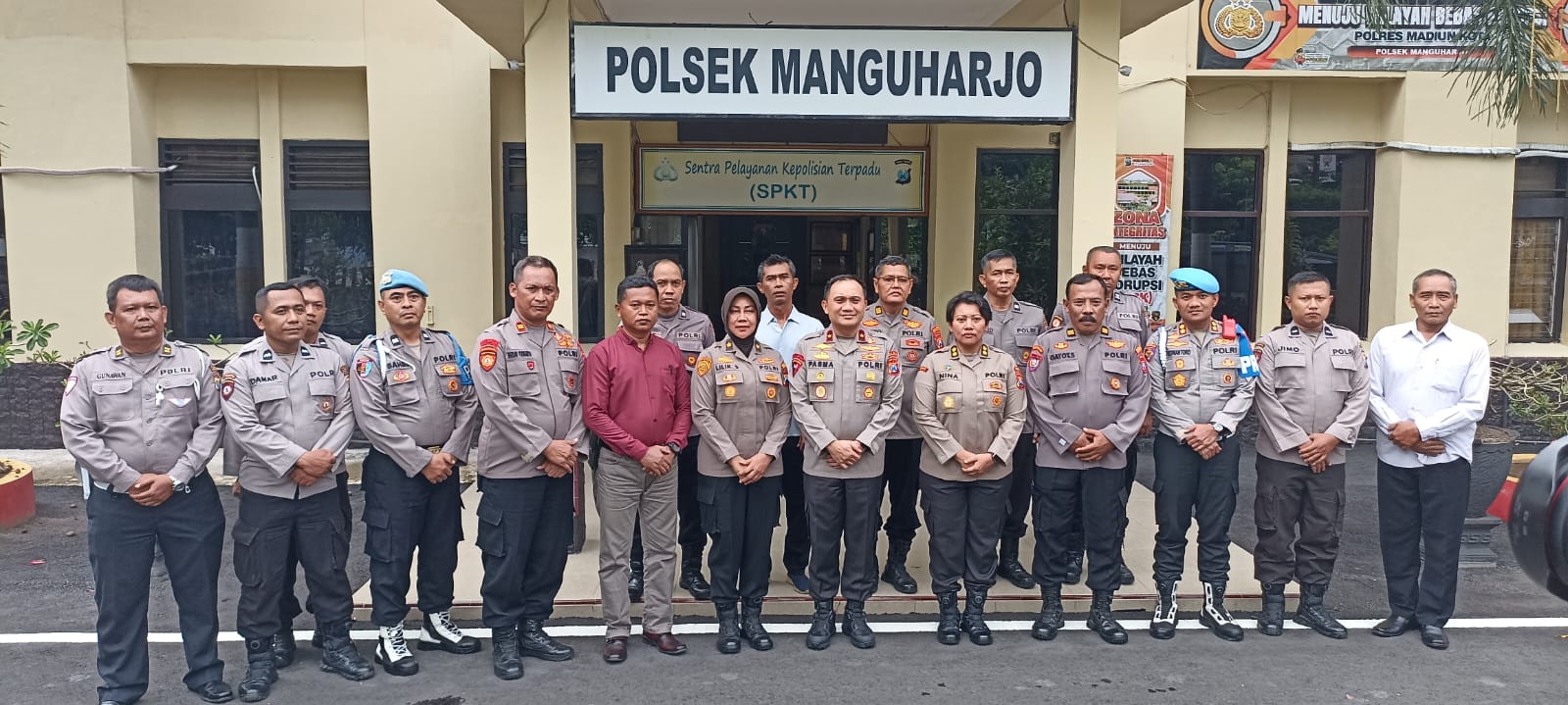 Turut hadir menyambut, Kapolres Madiun Kota AKBP Wiwin Junianto Supriyadi, S.I.K, Wakapolres Madiun kota Kompol Dr. I Gusti Agung Ananta Pratama, S.H., S.I.K., M.H., Kapolsek Manguharjo Kompol Lilik Sulastri, S.H., M.H., Waka Polsek AKP Narto, S.H., serta personel Polsek dan SPKT Polres Madiun Kota.