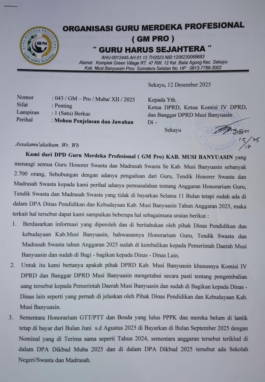 Sekayu, Pada Hari Jum’at 19 Desember 2025 2.700 Guru honorer swasta dan Madrasah swasta kembali berkirim surat Kepada DPRD Musi Banyuasin Provinsi Sumatera selatan mempertanyakan kejelasan dari pada Anggaran honorarium tahun 2025 yang tidak di berikan kepada guru honorer sudah 12 bulan alias satu tahun sementara di DPA Induk Dikbud muba anggaran honorarium tersebut ada, tapi kenapa tidak di berikan.