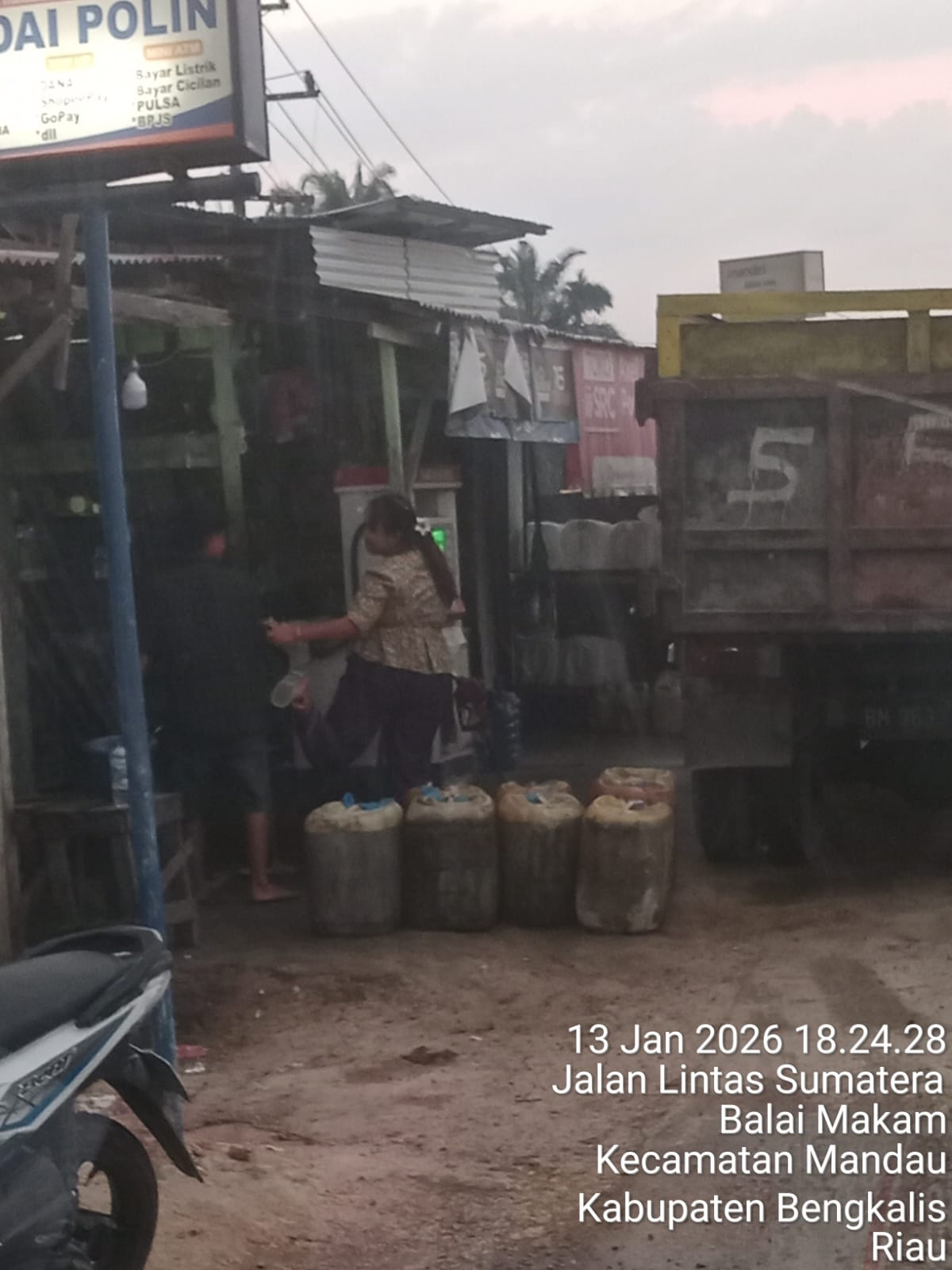Berdasarkan pantauan di lapangan pada Selasa (13/01/2026), terlihat aktivitas yang sangat mencurigakan. Deretan jeriken berkapasitas besar tampak berjejer di depan sebuah bangunan yang juga merangkap sebagai kedai. Ironisnya, aktivitas pemindahan BBM ke dalam jerigen ini dilakukan secara terbuka di pinggir jalan lintas yang ramai, seolah-olah tidak tersentuh oleh pengawasan aparat.