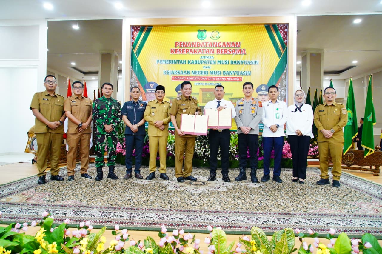 Perkuat tata kelola pemerintahan yang baik dan aman secara hukum, Pemerintah Kabupaten Musi Banyuasin (Pemkab Muba) bersama Kejaksaan Negeri Muba menandatangani Naskah Kesepakatan Bersama Bidang Perdata dan Tata Usaha Negara. Penandatanganan digelar pada Senin (20/4/2025) di Guest House Griya Bumi Serasan Sekate.