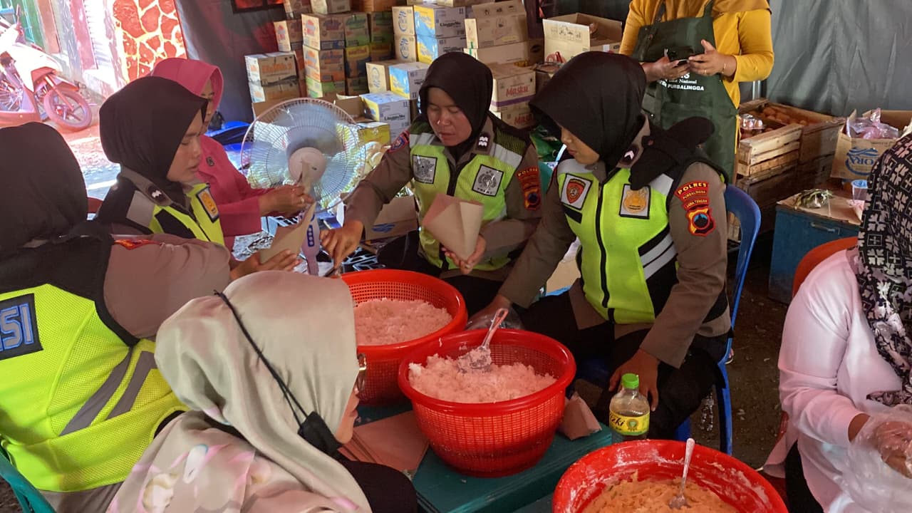 Selain itu, menyerahkan bantuan selimut bagi warga yang masih mengungsi di rumah-rumah penduduk. Sedangkan Polwan membantu memasak makanan di dapur umum yang didirikan BPBD Kabupaten Purbalingga.