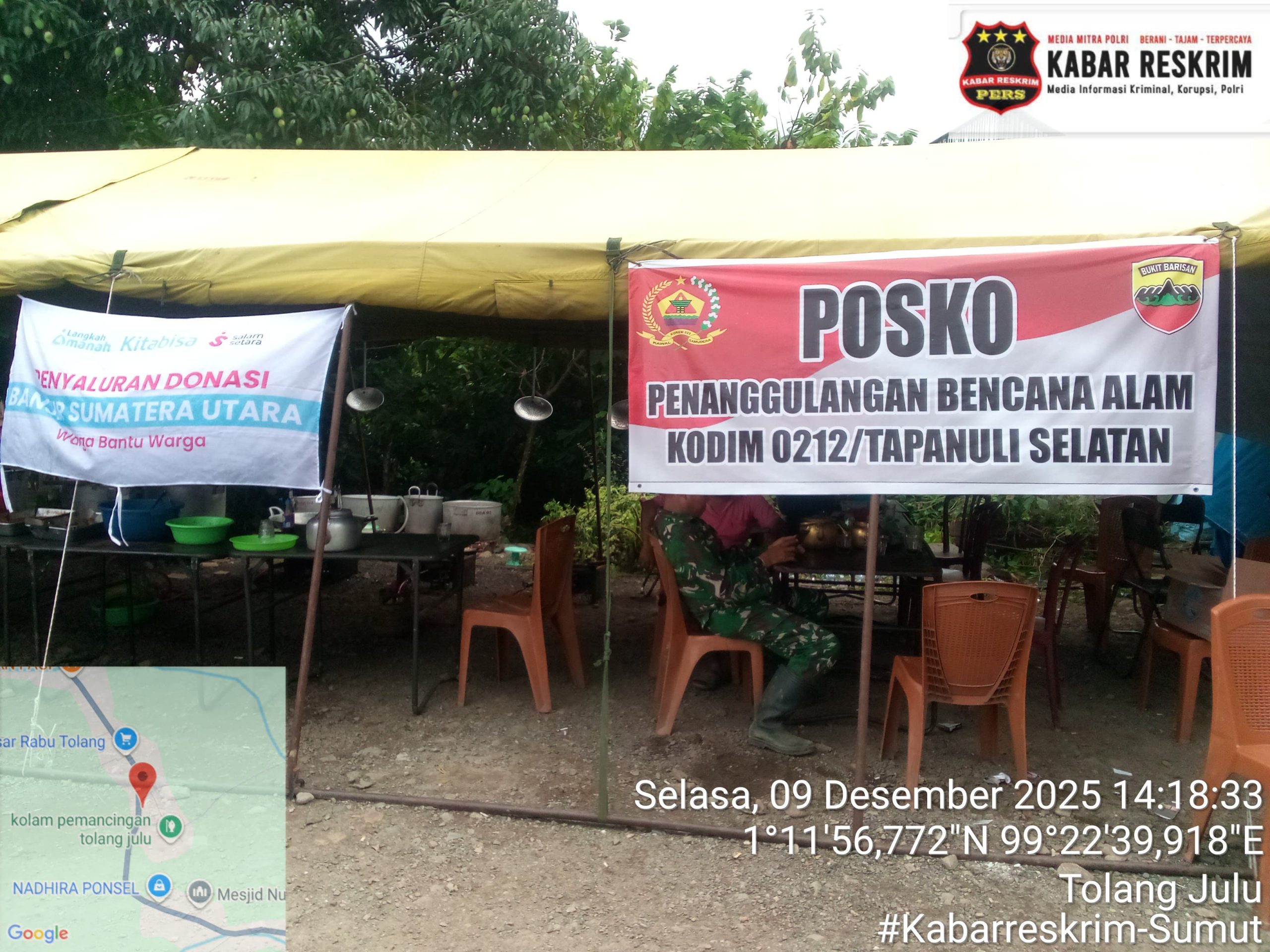 Kepala Desa Tolang Julu Puad Daulay didampingi Danramil 11 Batang Angkola Kapten Mula Siagian saat ditemui wartawan, Selasa (9/12/2025) di posko penanggulangan bencana alam yang didirikan TNI kepada wartawan mengatakan, Dampak Bencana Banjir Bandang yang menimpa Desa Tolang Julu ada 15 unit rumah warga hancur rata dengan tanah, 40 unit rumah hancur dan MTSN 4 TAPSEL rusak parah, tapi Alhamdulillah Atas Kesigapan Babinsa Sertu Alfikri mengevakuasi warga tidak ada korban jiwa.