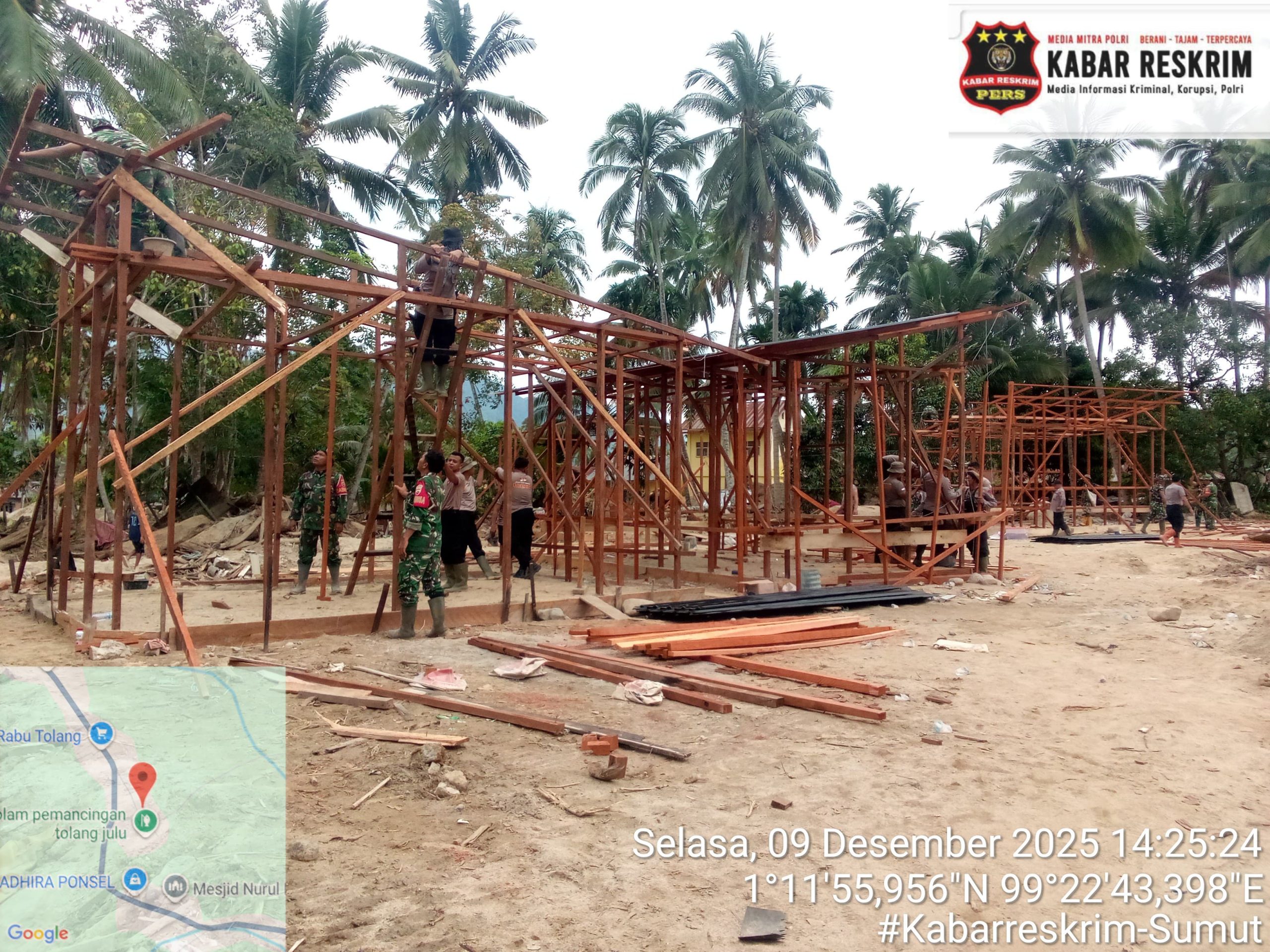 Hasil musyawarah dan berkat kekompakan di bantu personil TNI – POLRI rumah warga yang hancur diterjang banjir bandang di Desa Tolang Julu, Kecamatan Sayurmatinggi, Kabupaten Tapanuli Selatan (Tapsel), Provinsi Sumatera Utara kini sudah mulai dibangun.