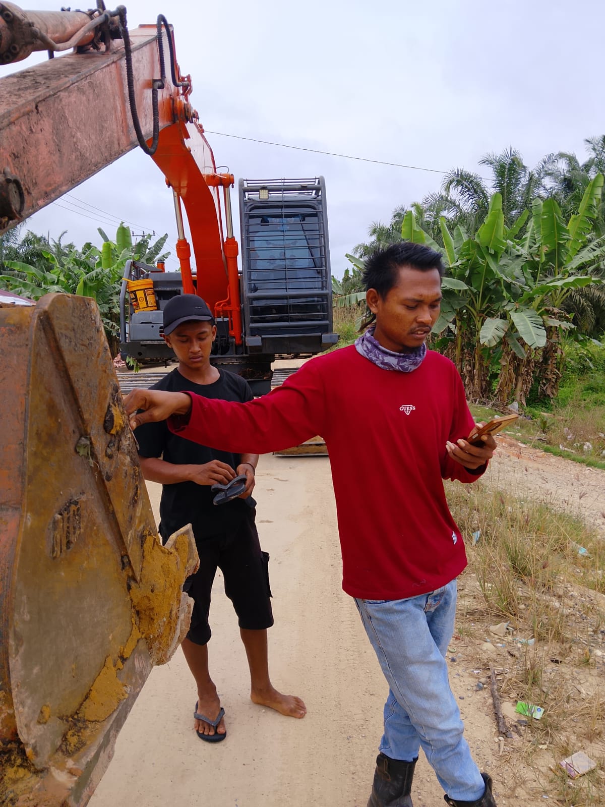 ” Jangan Jangan Jangan masukkan alat berat melalui jalan beton kita ,Pakai Trado Saja ” tegas Bapak Camat Kubu DR Syafrizal melalui sambungan Telpon kepada Mandor alat berat Roni yang Ingin melintasi jalan lintas di Teluk Piyai Pesisir