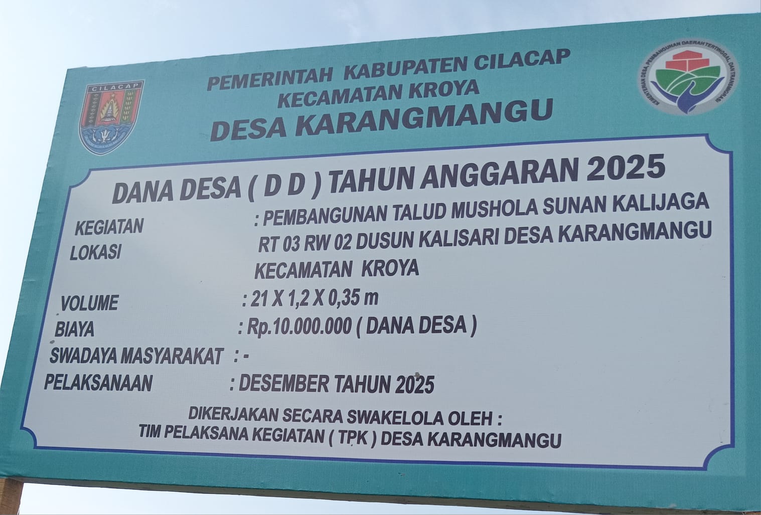 Sejalan dengan prinsip transparansi publik, proyek dengan nilai anggaran sebesar Rp10.000.000,- ini dikerjakan secara swakelola oleh Tim Pelaksana Kegiatan (TPK) Desa Karangmangu.