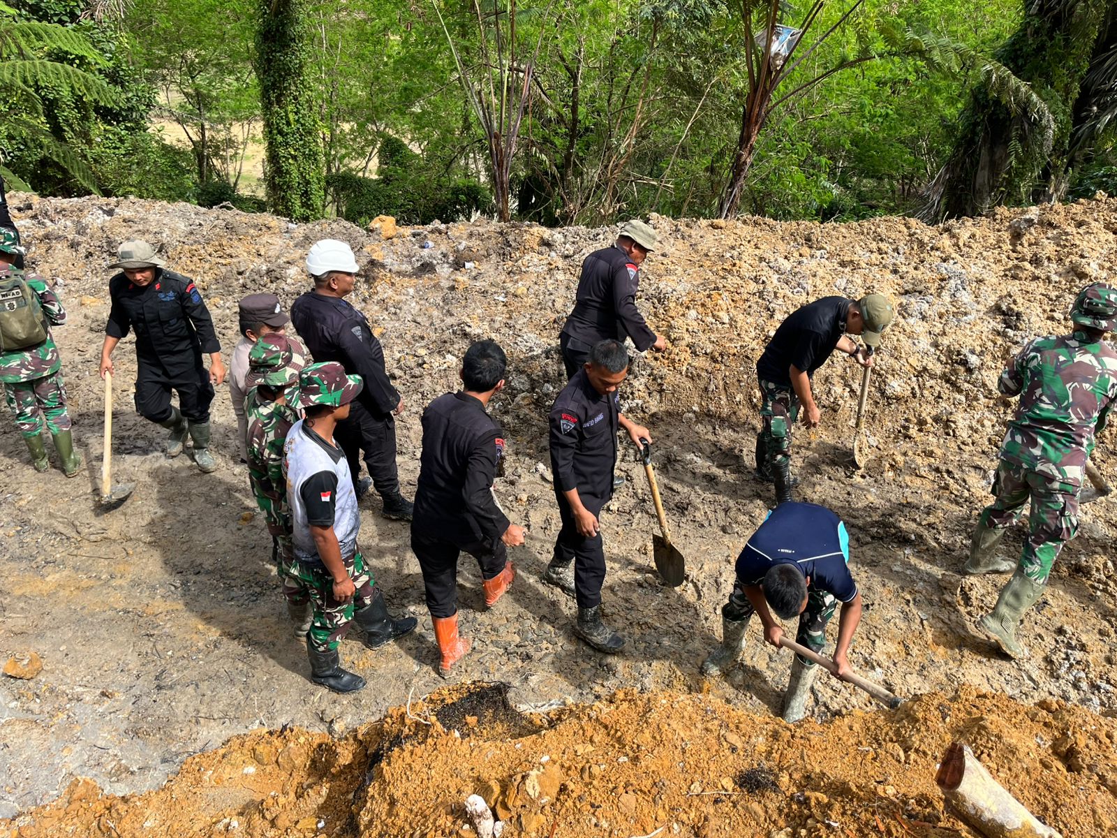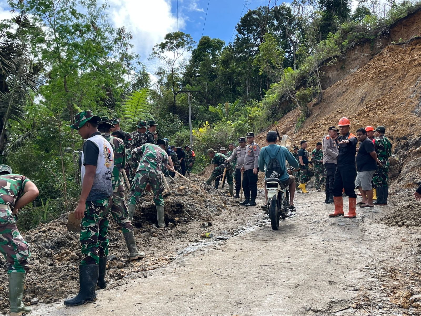 Usai Apel, tepat pukul 10.00 WIB, Personel Gabungan turun ke Lokasi Terdampak Bencana Alam Tanah Longsor di Dusun Kampung Baru. Material Tanah yang menumpuk di Bahu dan Badan Jalan dibersihkan dengan Peralatan Manual dibantu Kendaraan Taktis. Proses pembersihan dilakukan secara bergotong royong, menyisir titik-titik yang menutup Jalur Jalan Utama.