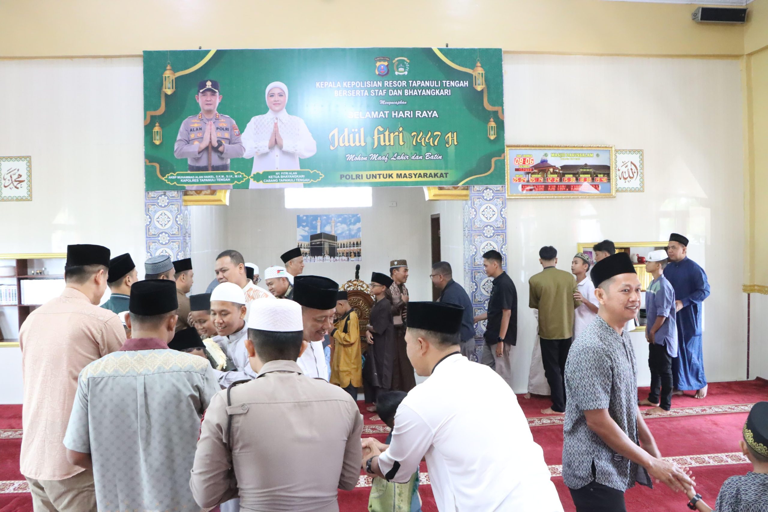 Suasana khidmat di Masjid Darussalam, Jajaran Polres Tapanuli Tengah bersama Masyarakat Sekitar melaksanakan Sholat Idul Fitri 1447 Hijriah, Sabtu (21/03/2026). Ibadah Sholat Id ini cermin sinergi keharmonisan Polres Tapanuli Tengah dengan Warga di Lingkungan Sekitar Mako Polres Tapanuli Tengah.