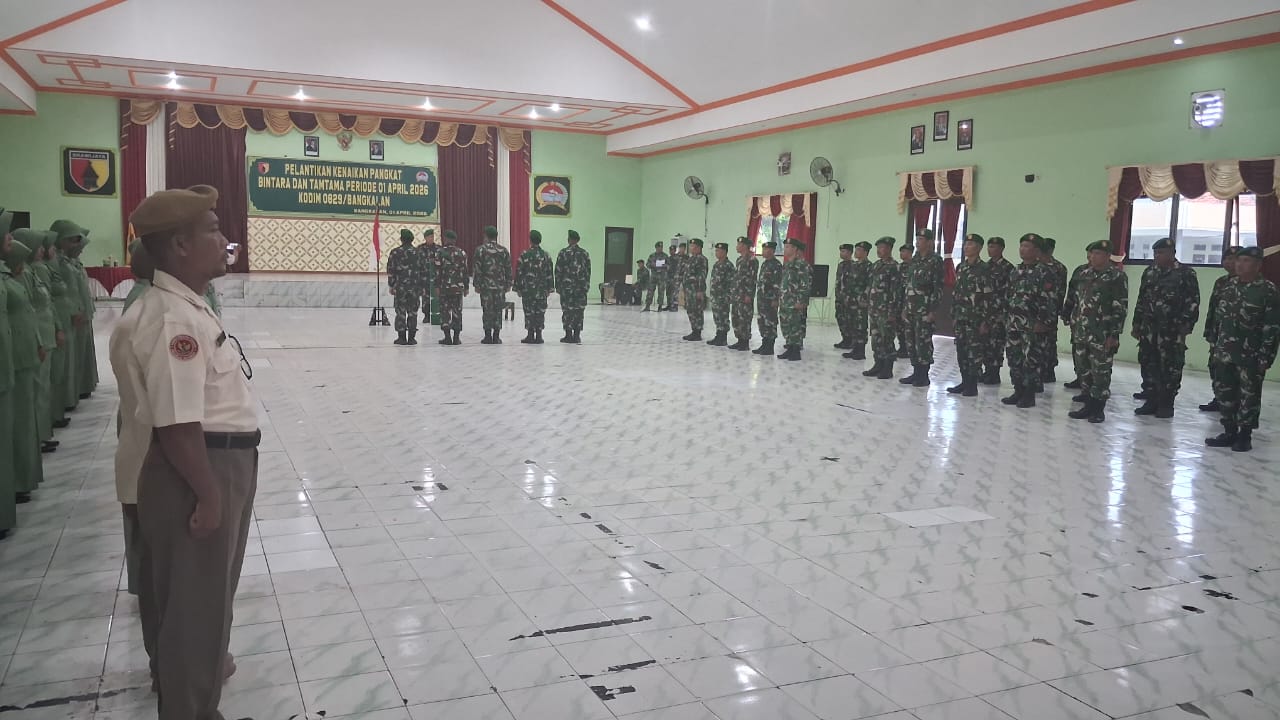 Upacara pelantikan kenaikan pangkat Bintara dan Tamtama periode 1 April 2026 digelar khidmat di Gedung Manunggal Makodim 0829/Bangkalan, Rabu (1/4/26) siang. Kegiatan ini dipimpin langsung oleh Inspektur Upacara Mayor Inf Hendhi Meindrawarman selaku Kasdim 0829/Bangkalan, serta diikuti sekitar 100 peserta.