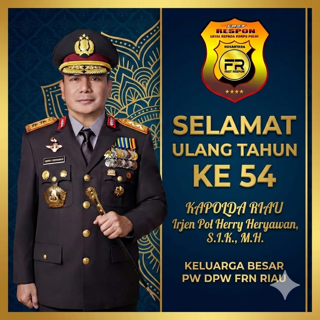Ketua Perkumpulan Wartawan Fast Respon Nusantara (PW-FRN), wilayah Riau Adam Silaen ,beserta seluruh jajaran pengurus wilayah Riau dan kabupaten menyampaikan ucapan selamat ulang tahun yang ke-54 untuk Kapolda Riau Irjen pol Herry Heryawan S.I.K M.H.
