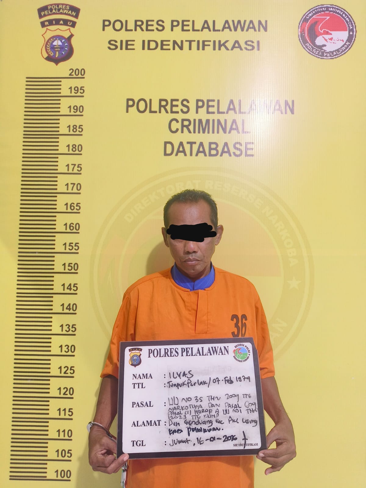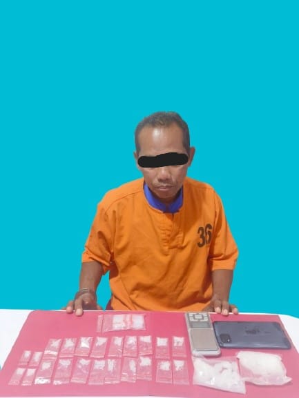 Tersangka insial I, warga Desa Genduang, Kec. Pangkalan Lesung, Kab. Pelalawan, ditangkap saat sedang berdiri di pinggir jalan dengan mencurigakan. Barang bukti yang disita antara lain 24 paket narkotika jenis sabu dengan berat kotor 62,59 gram, 1 buah plastik klip biru, 1 buah plastik asoy warna putih, 1 unit timbangan digital, dan 1 bal plastik bening klip merah.