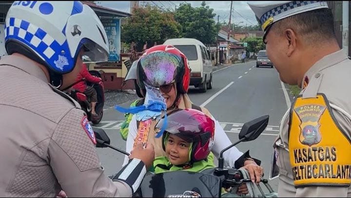 Pengendara yang menunjukkan kelengkapan surat-surat, mengenakan helm, dan mematuhi aturan—baik dari arah Riau maupun Sumbar—mendapatkan hadiah kecil sebagai bentuk apresiasi.