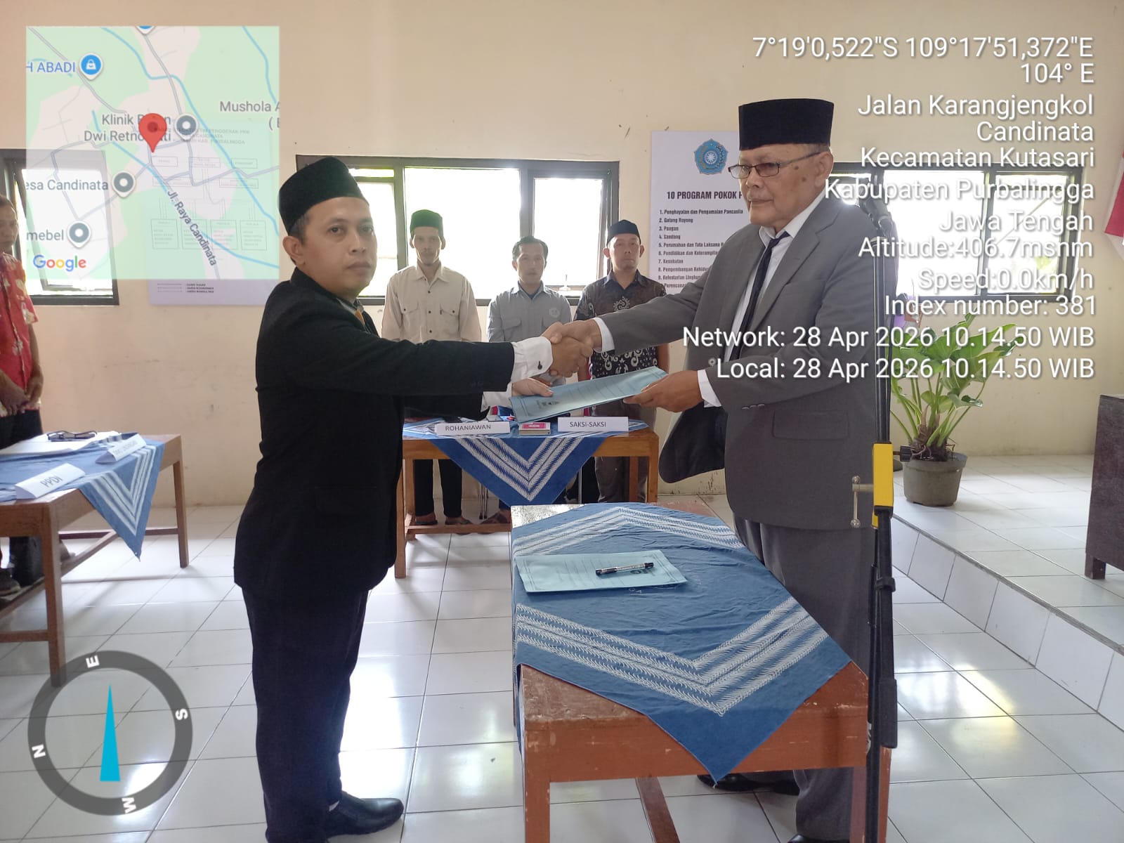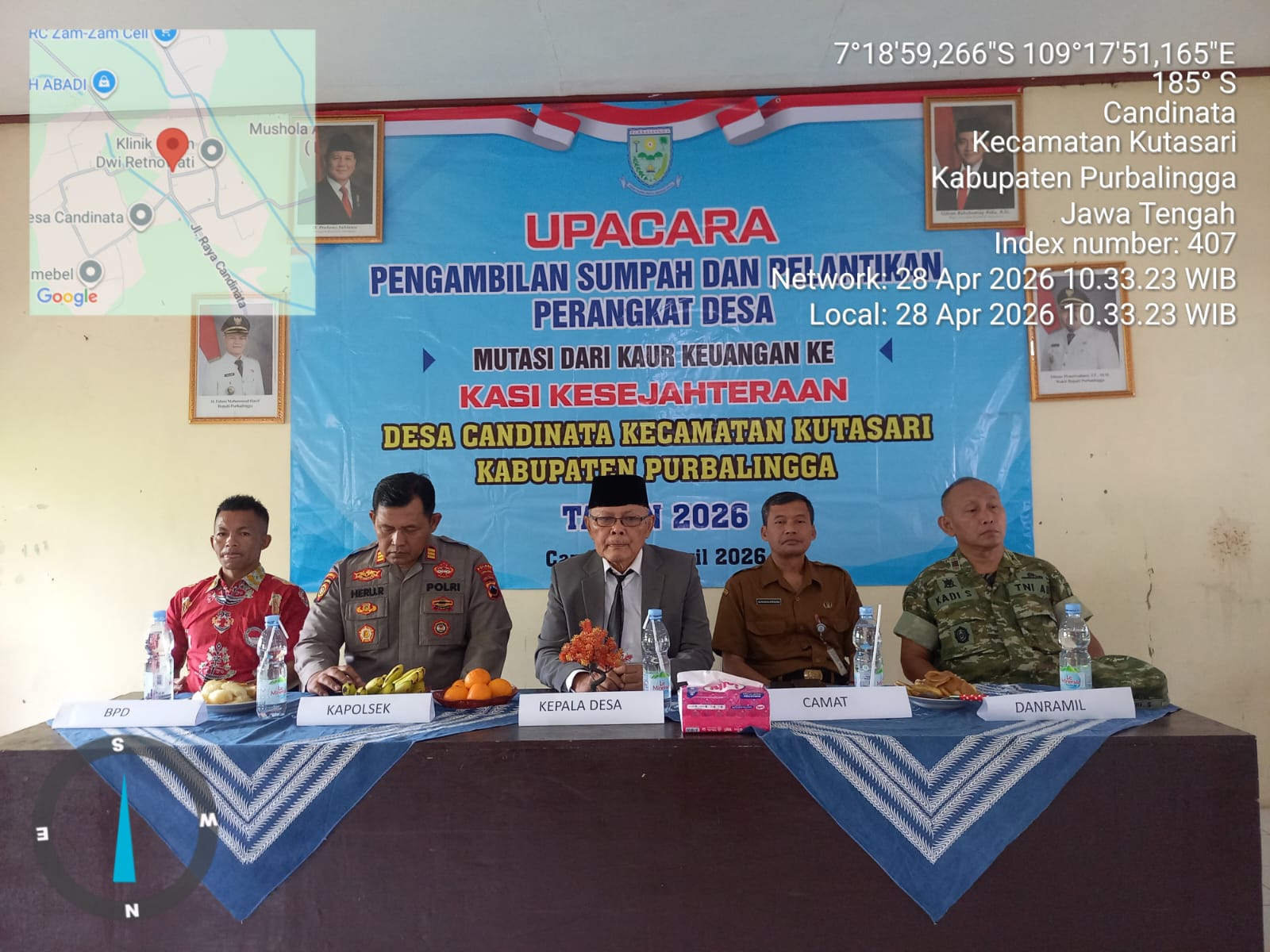 Bertempat di Balai Desa Candinata Kecamatan Kutasari,Kabupaten Purbalingga,pada Hari Selasa tanggal 28 April 2026 mulai pukul 08.00 WIB – Selesai dilaksanakan Pengambilan Sumpah Jabatan dan Pelantikan Perangkat Desa baru desa Candinata,atas nama Teguh Alim Mustofa, S. Pd dengan jabatan Kaur Keuangan Mutasi ke Kasi Kesejahteraan.