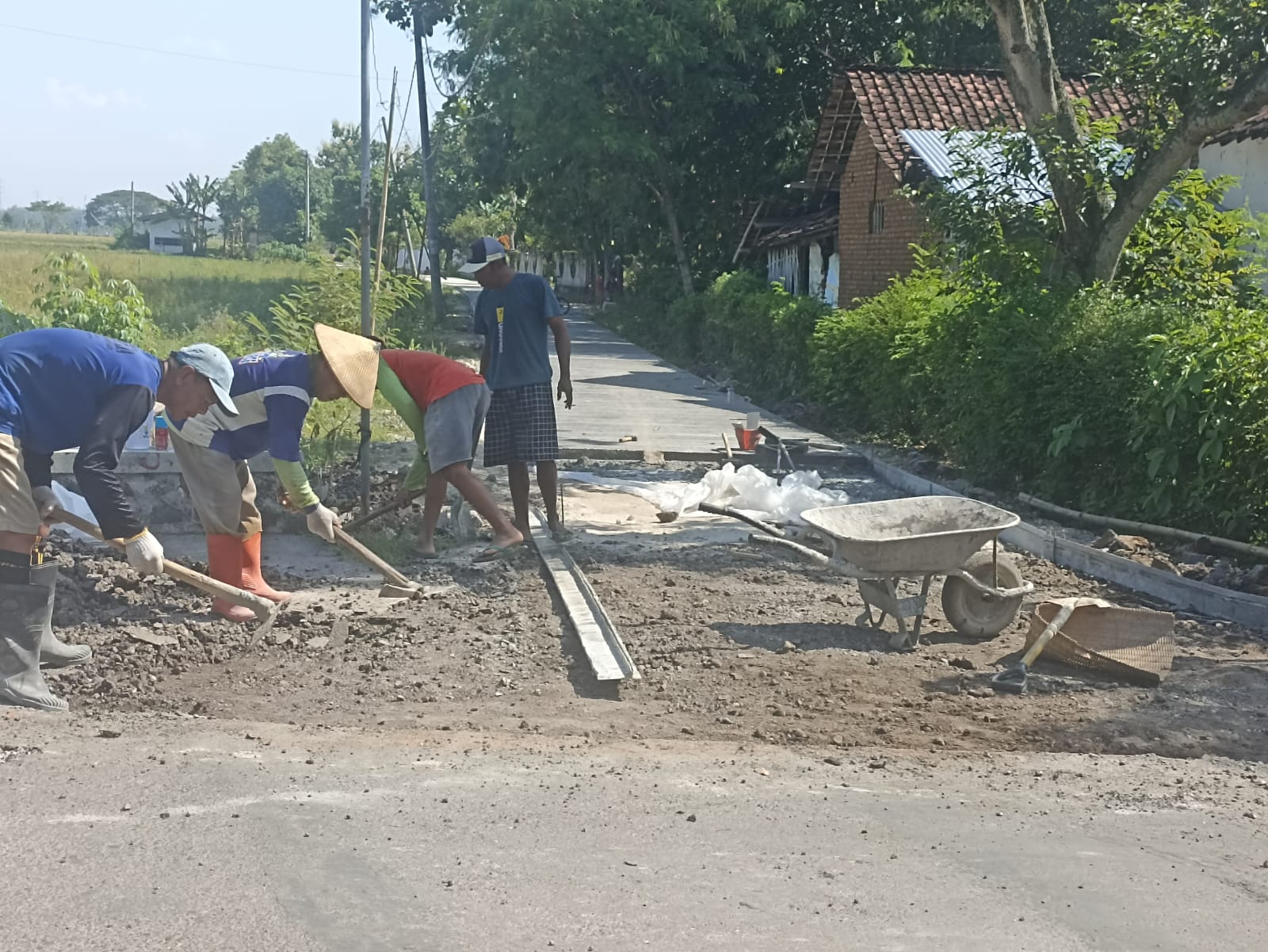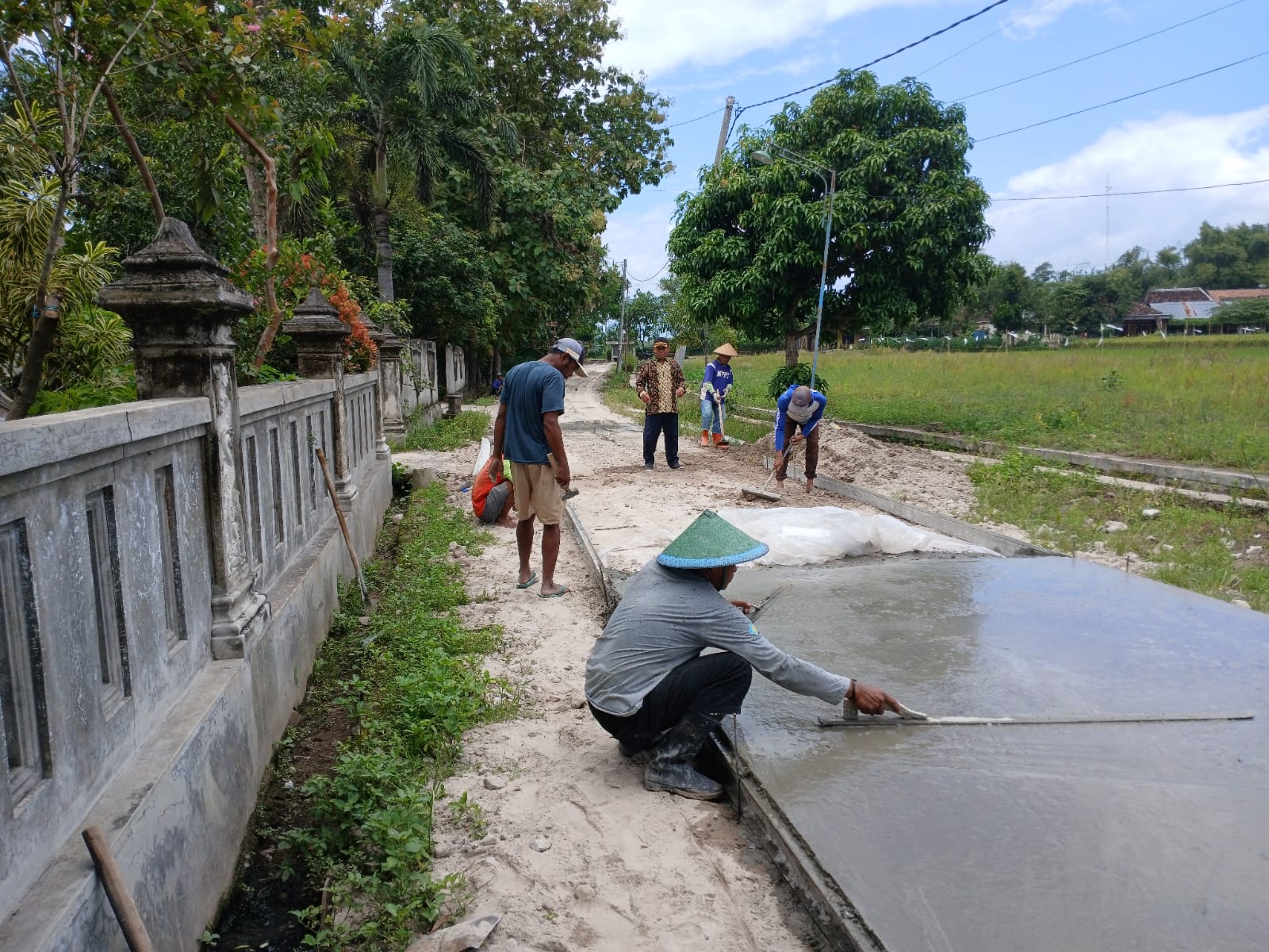Para pekerja tengah melaksanakan pengerjaan rabat jalan dusun.