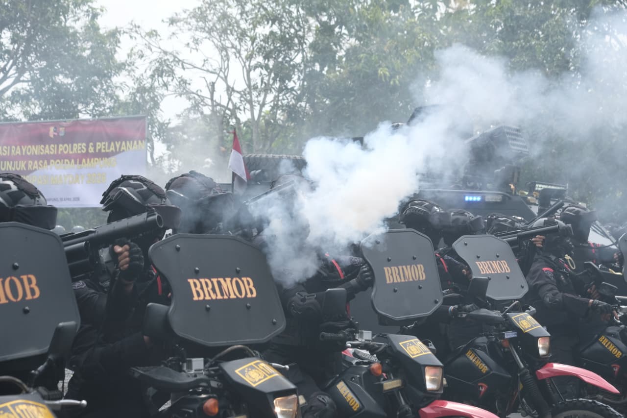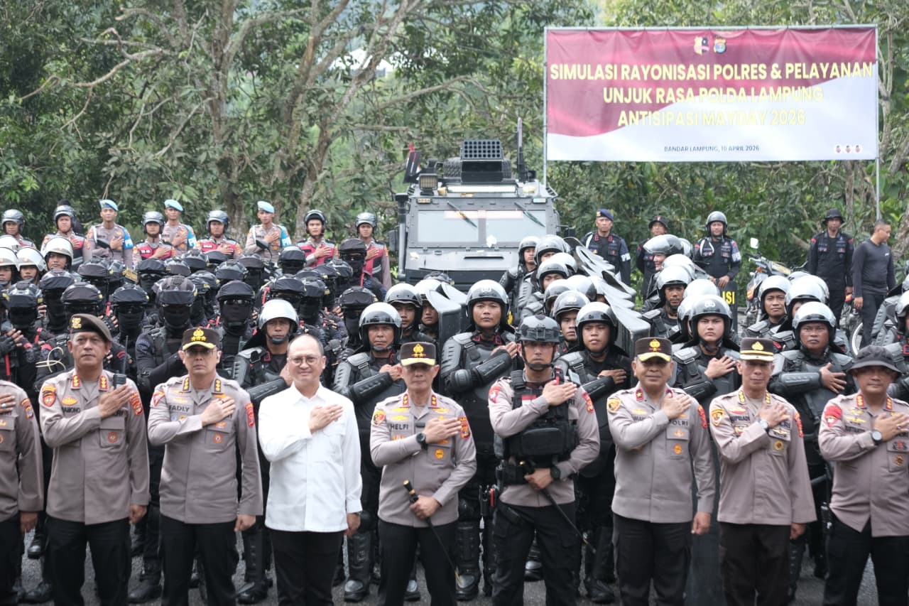 Polda Lampung melaksanakan kegiatan simulasi rayonisasi polres dan penanganan unjuk rasa di Sekolah Polisi Negara (SPN) Polda Lampung sebagai langkah antisipasi menghadapi peringatan Hari Buruh Internasional atau May Day 2026, Rabu (15/04/2026).