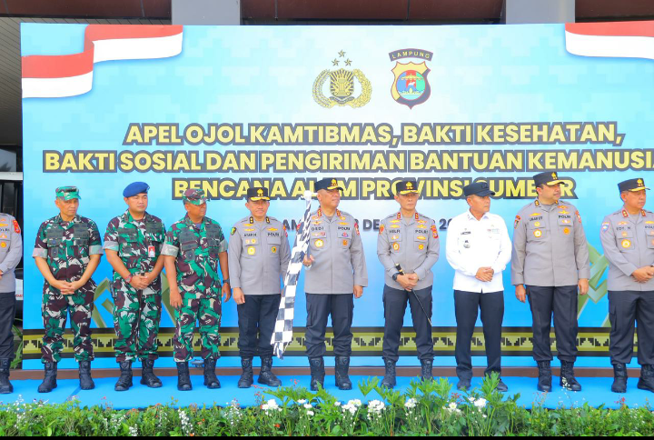 Polda Lampung dalam rangka apel ojek online kamtibmas yang dipimpin langsung oleh Wakapolri Komjen Pol Dedi Prasetyo, juga melepas pemberangkatan bantuan sosial kepada wilayah yang terdampak bencana alam di Sumatra Barat. Rabu, (3/12/2025).