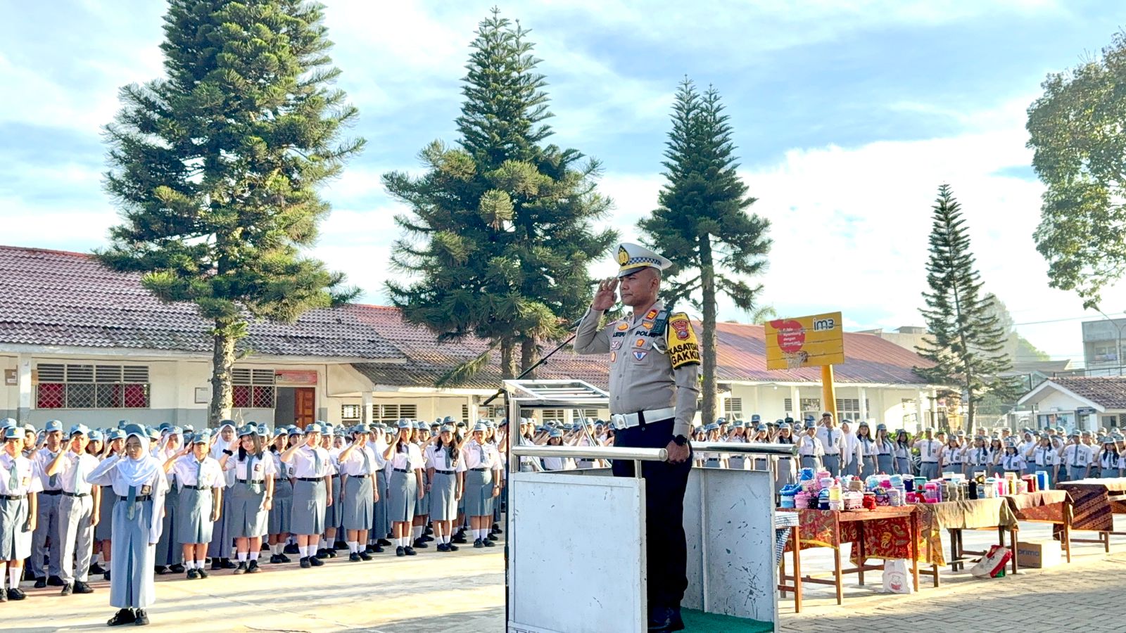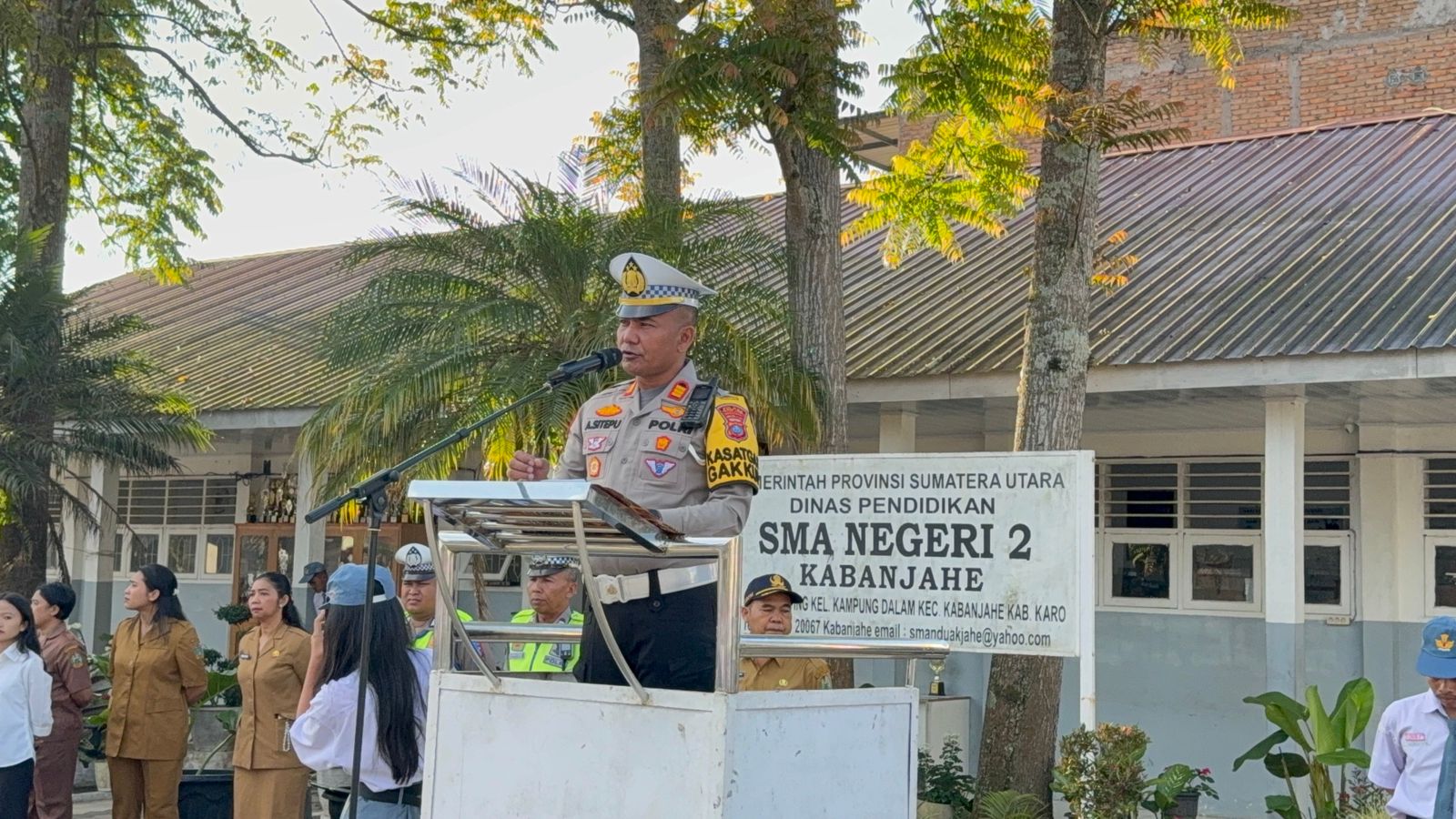 Satuan Lalu Lintas Polres Tanah Karo melaksanakan kegiatan Police Go To School terkait Operasi Kepolisian Kewilayahan Keselamatan Toba 2026. Kegiatan tersebut berlangsung, Senin (09/02/2026), pukul 07.00 WIB di SMA Negeri 2 Kabanjahe, Kabupaten Karo.
