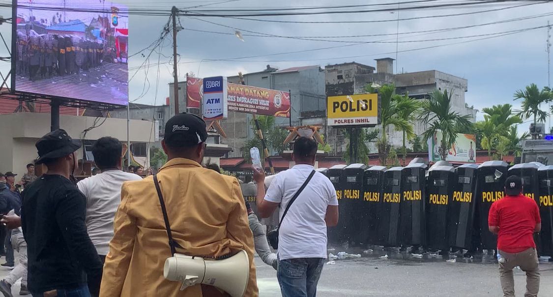 Ratusan massa menyeruduk Mapolres Indragiri Hilir (Inhil) hingga menimbulkan kericuhan. Situasi sempat memanas dengan adanya aksi pelemparan bom, pembakaran ban, hingga upaya menerobos masuk markas kepolisian. pada Selasa (23/09/2025) siang.