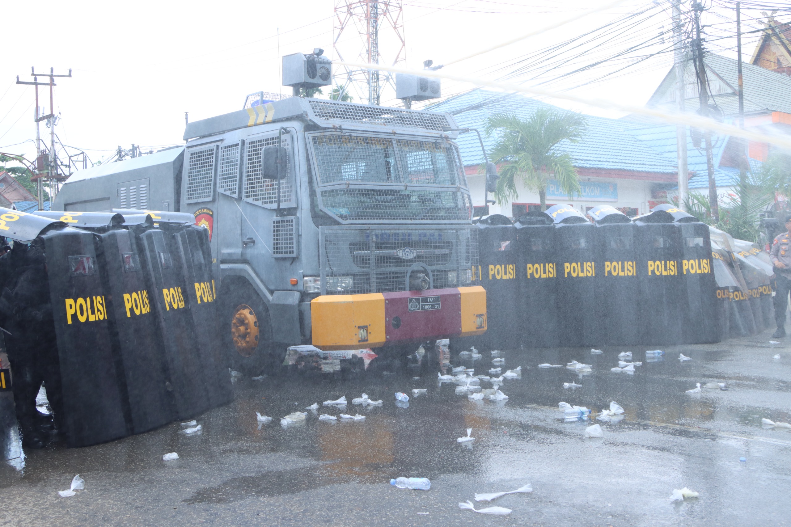 Berbagai sarana taktis langsung dikerahkan. Kendaraan pengendali massa disiagakan penuh untuk menghadapi massa sekitar 600 yang semakin anarkis.