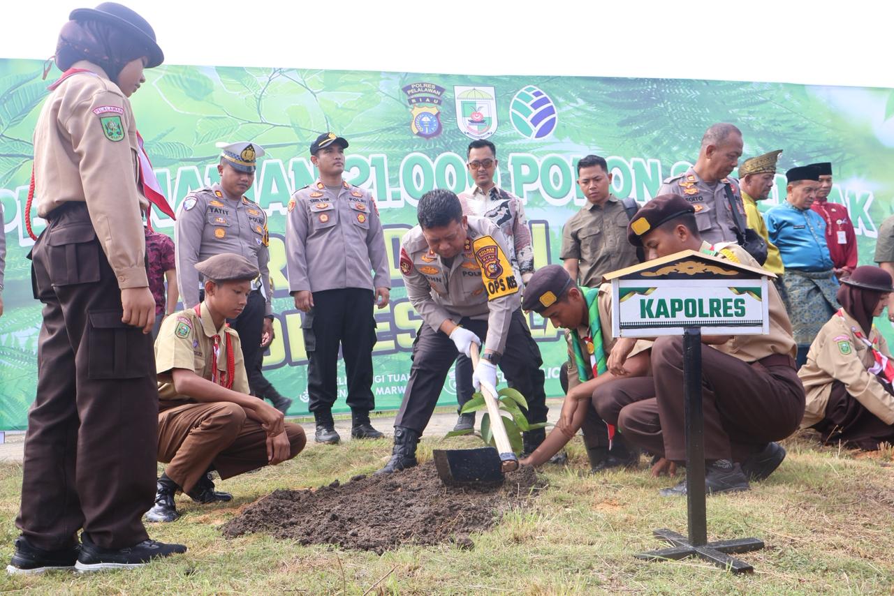 Kapolres Pelalawan AKBP John Louis Letedara, S.I.K, dalam sambutannya menyatakan bahwa kegiatan penanaman pohon ini merupakan bagian dari kegiatan besar yang dilaksanakan serentak mulai dari tingkat Polda hingga Polsek, dengan target penanaman sebanyak 21.000 bibit pohon. “Ini bukan sekadar kegiatan seremonial, tetapi merupakan bentuk kepedulian dan tanggung jawab bersama untuk menjaga lingkungan,” ujarnya.