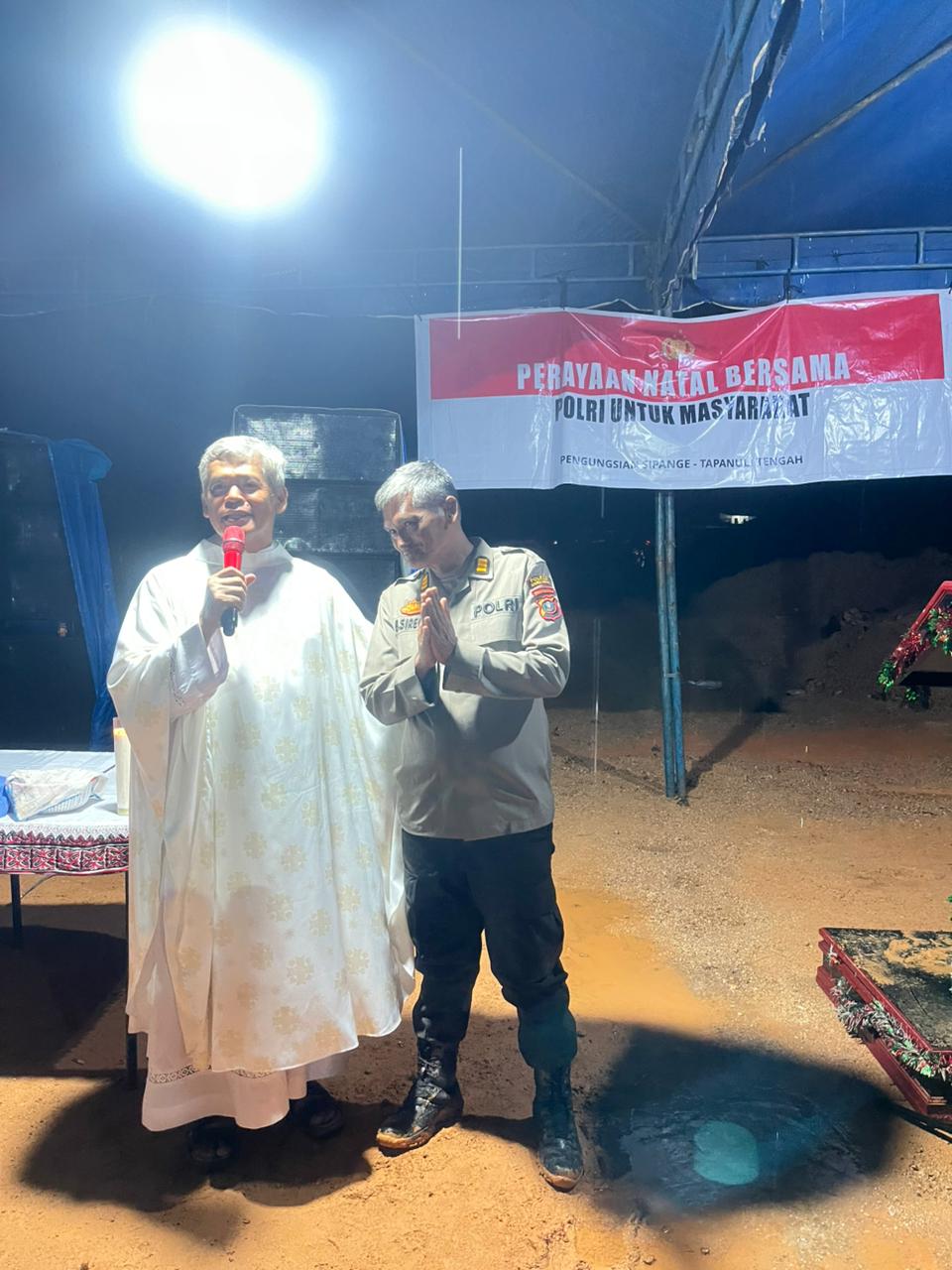 Masih suasana duka pasca bencana alam, Kepolisian Resor (Polres) Tapanuli Tengah menunjukkan kepeduliannya memfasilitasi Perayaan Ibadah Natal bagi Warga Terdampak di Posko Pengungsian Simpang Sipange-Hutanabolon, Kelurahan Tukka, Kecamatan Tukka, Kabupaten Tapanuli Tengah, Rabu (24/12/2025) malam.